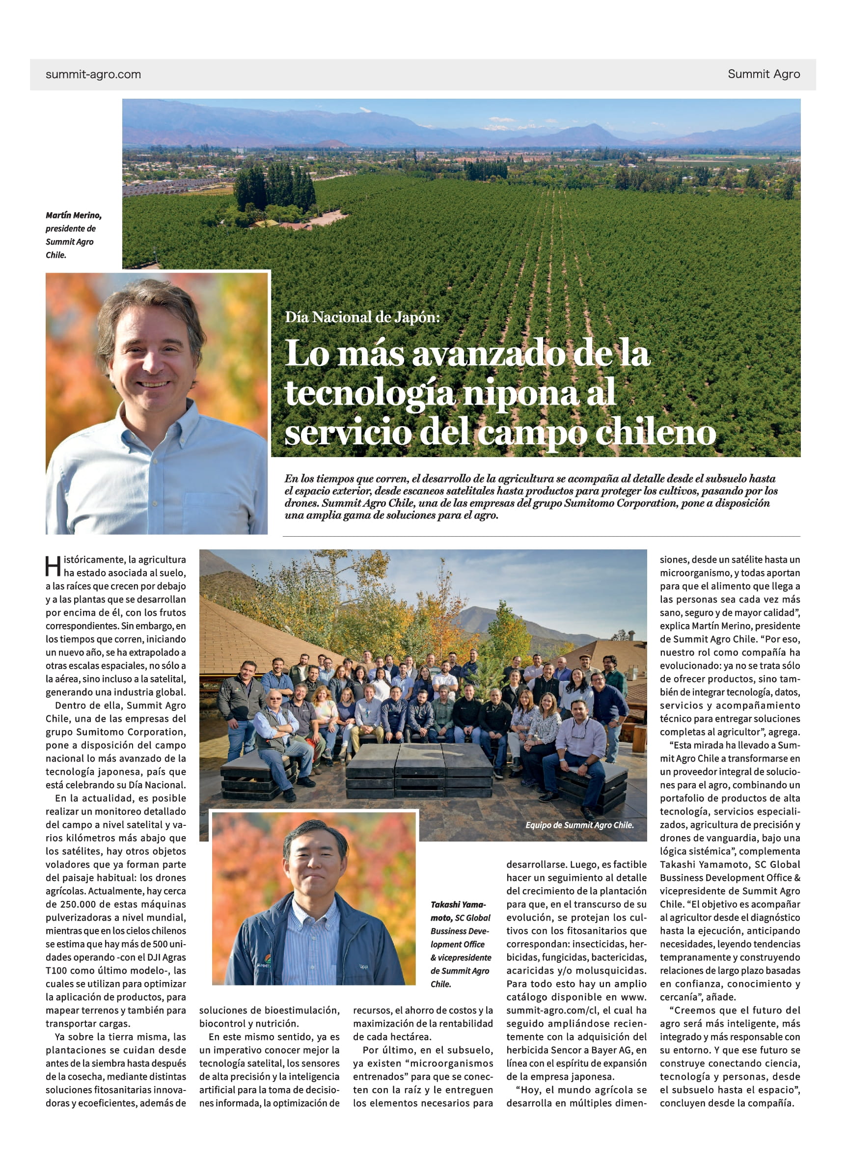 En los tiempos que corren, el desarrollo de la agricultura se acompaña al detalle desde el subsuelo hasta el espacio exterior, desde escaneos satelitales hasta productos para proteger los cultivos, pasando por los drones. Summit Agro Chile, una de las empresas del grupo Sumitomo Corporation, pone a disposición una amplia gama de soluciones para el agro.