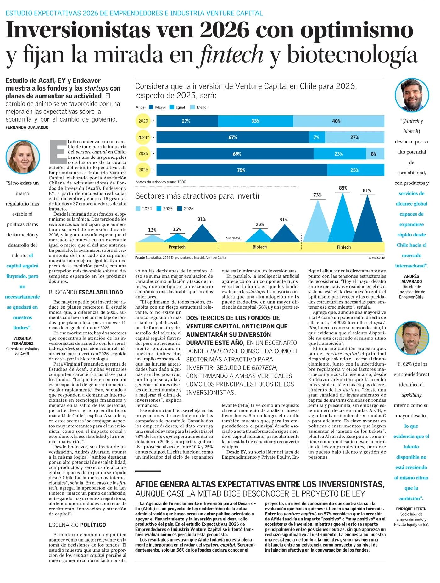 Estudio de Acafi, EY y Endeavor muestra a los fondos y las startups con planes de aumentar su actividad . El cambio de ánimo se ve favorecido por una mejora en las expectativas sobre la economía y por el cambio de gobierno. Fernanda Guajardo