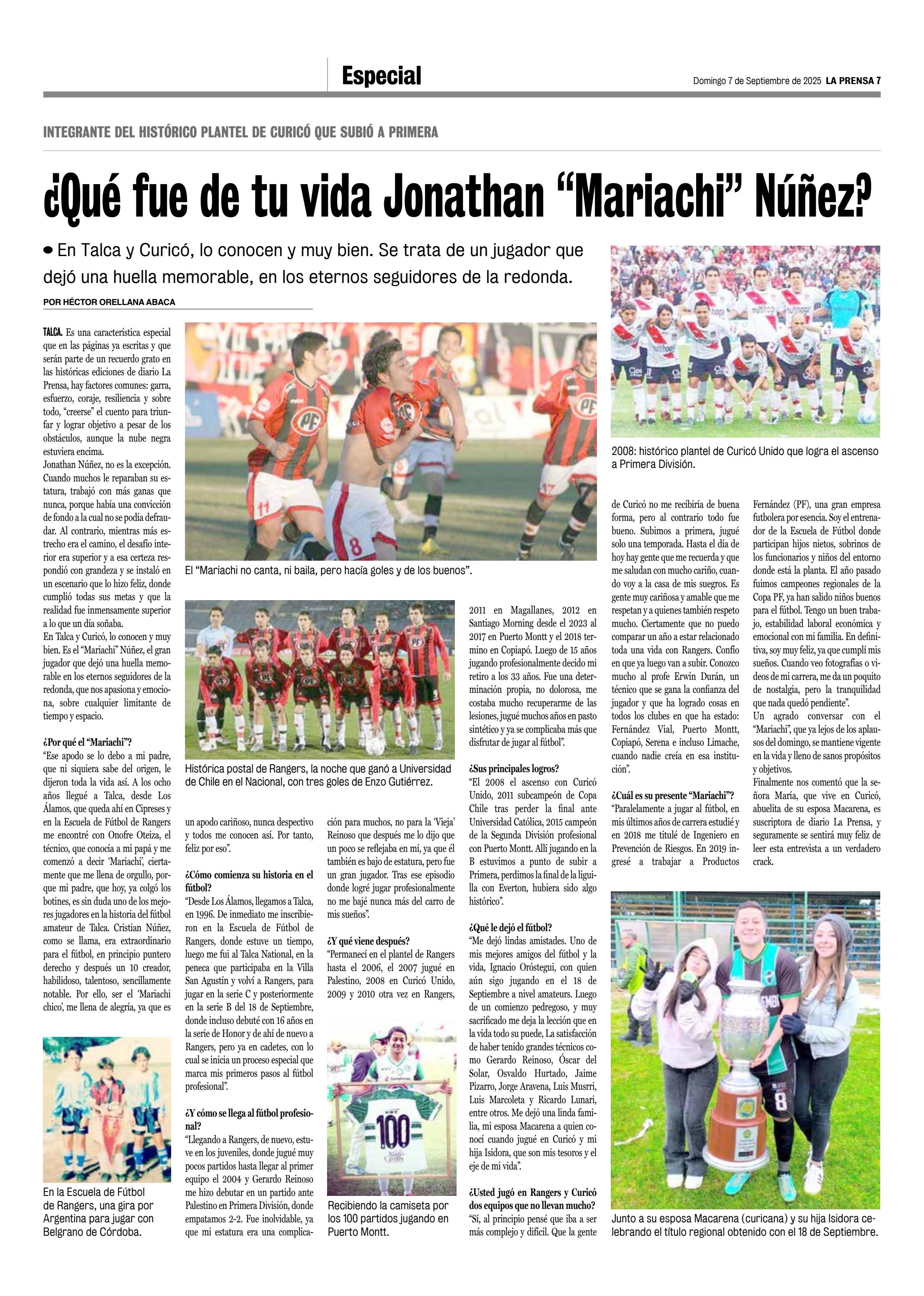 Jonathan Núñez, no es la excepción. Cuando muchos le reparaban su estatura, trabajó con más ganas que nunca, porque había una convicción de fondo ala cual no se podía defraudar. Al contrario, mientras más estrecho era el camino, el desafío interior era superior y a esa certeza respondió con grandeza y se instaló en un escenario que lo hizo feliz, donde cumplió todas sus metas y que la realidad fue inmensamente superior alo que un día soñaba, En Talca y Curicó, lo conocen y muy bien. Es el “Mariachi” Núñez, el gran jugador que dejó una huella memorable en los eternos seguidores de la redonda, que nos apasiona y emociona, sobre cualquier limitante de tiempo y espacio