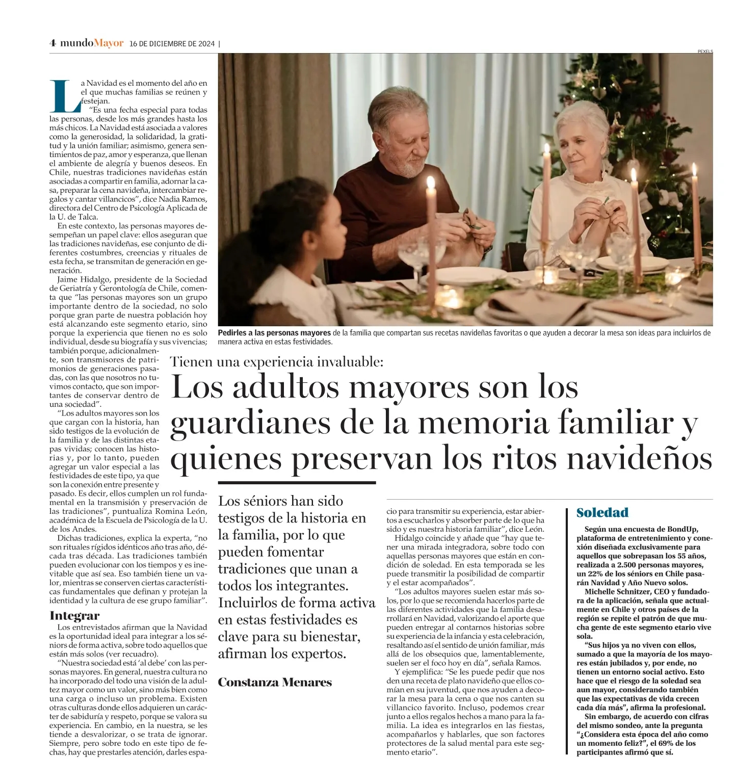 Según una encuesta de BondUp, plataforma de entretenimiento y conexión diseñada exclusivamente para aquellos que sobrepasan los 55 años, realizada a 2.500 personas mayores, un 22% de los séniors en Chile pasarán Navidad y Año Nuevo solos.