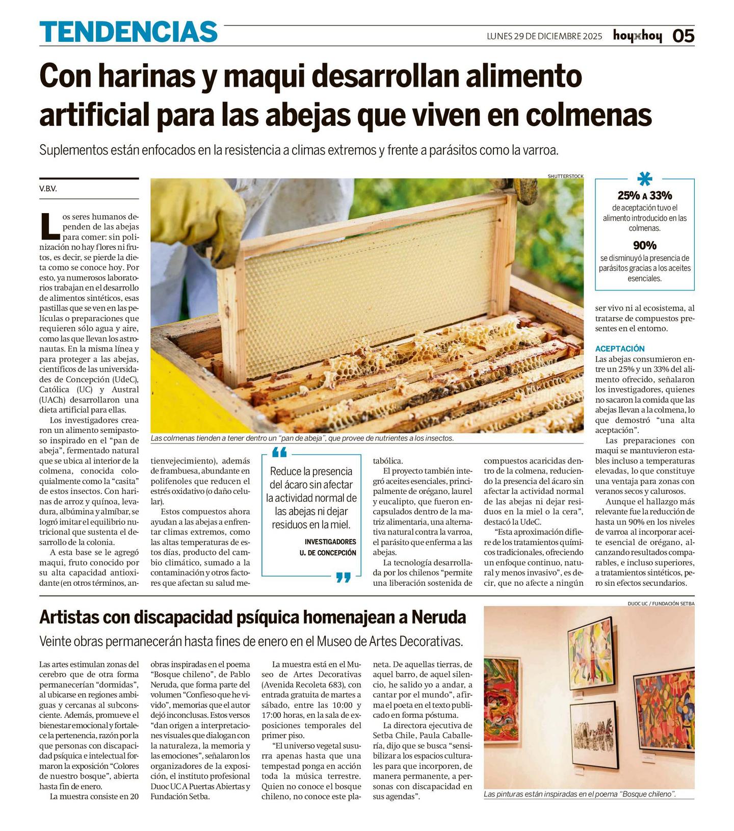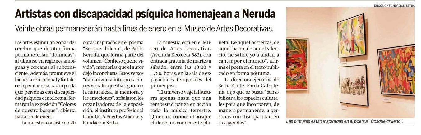Las artes estimulan zonas del cerebro que de otra forma permanecerían “dormidas”, al ubicarse en regiones ambiguas y cercanas al subconsciente. Además, promueve el bienestar emocional y fortalece la pertenencia, razón por la que personas con discapacidad psíquica e intelectual formaron la exposición “Colores de nuestro bosque”, abierta hasta fin de enero. La muestra consiste en 20 obras inspiradas en el poema “Bosque chileno”, de Pablo Neruda, que forma parte del volumen “Confieso que he vivido”, memorias que el autor dejó inconclusas. Estos versos “dan origen a interpretaciones visuales que dialogan con la naturaleza, la memoria y las emociones”, señalaron los organizadores de la exposición, el instituto profesional Duoc UC A Puertas Abiertas y Fundación Setba.