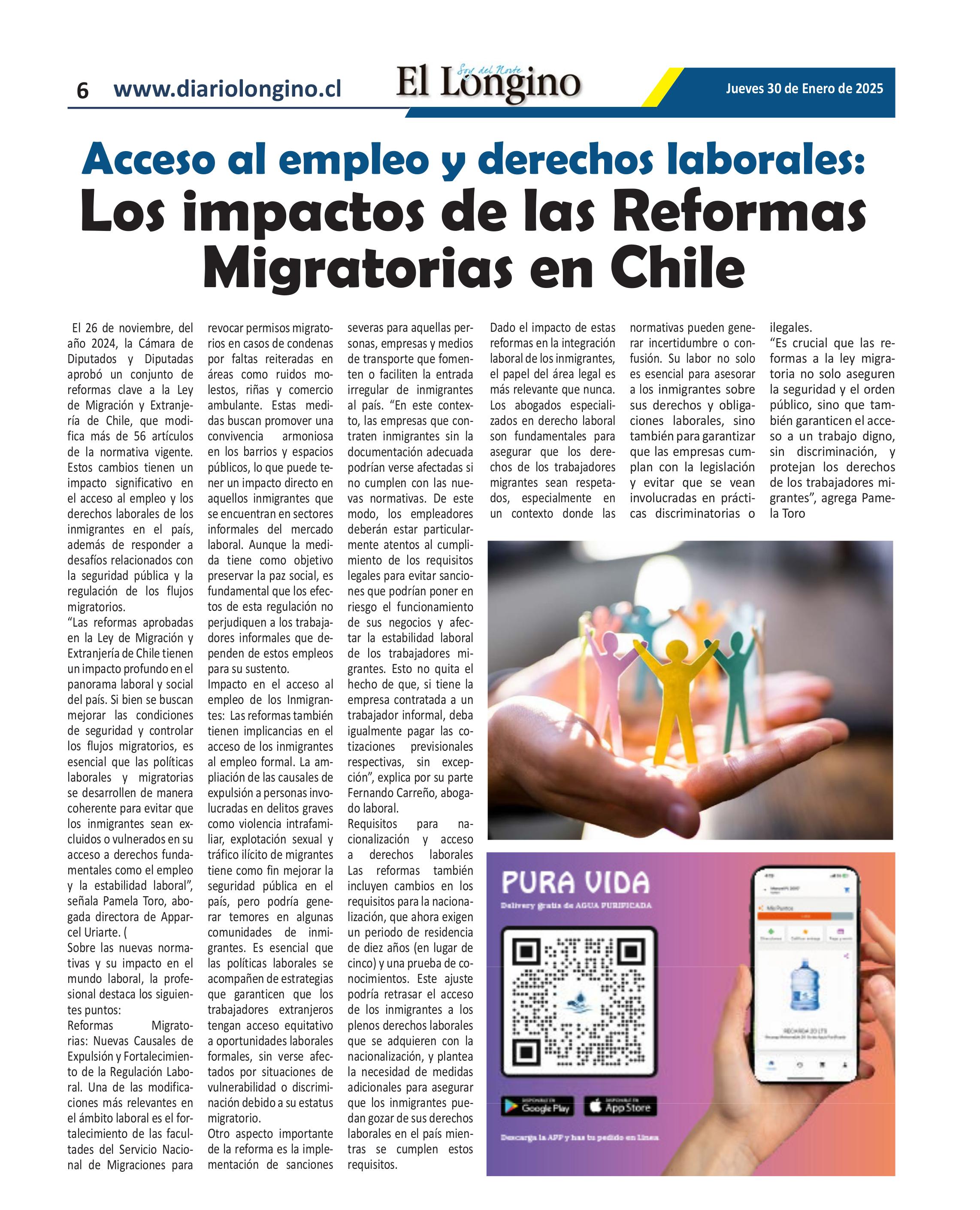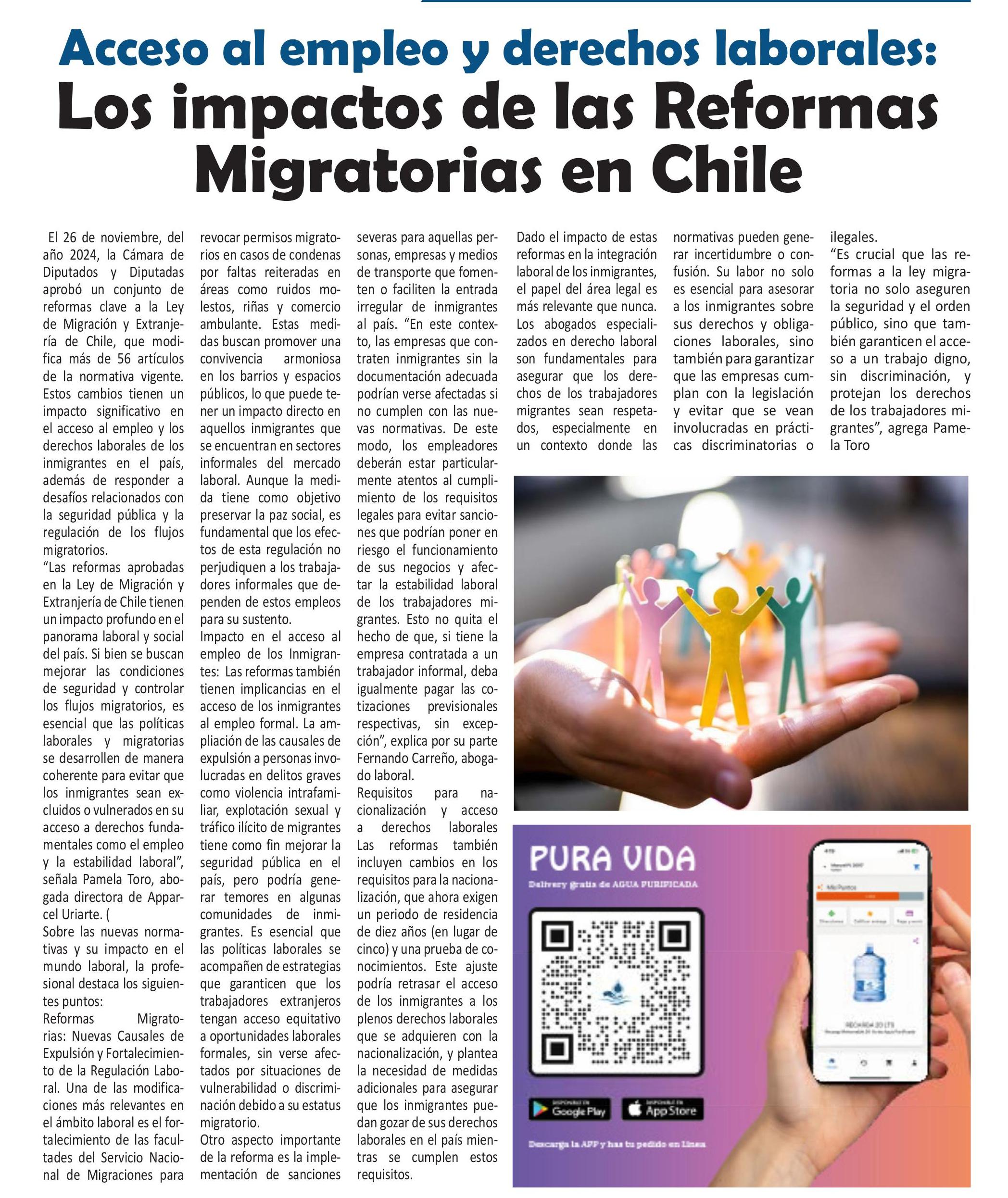 “Las reformas aprobadas en la Ley de Migración y Extranjería de Chile tienen un impacto profundo en el panorama laboral y social del país. Si bien se buscan mejorar las condiciones de seguridad y controlar los flujos migratorios, es esencial que las políticas laborales y migratorias se desarrollen de manera coherente para evitar que los inmigrantes sean excluidos o vulnerados en su acceso a derechos fundamentales como el empleo y la estabilidad laboral”, señala Pamela Toro, abogada directora de Appareil Uriarte. (