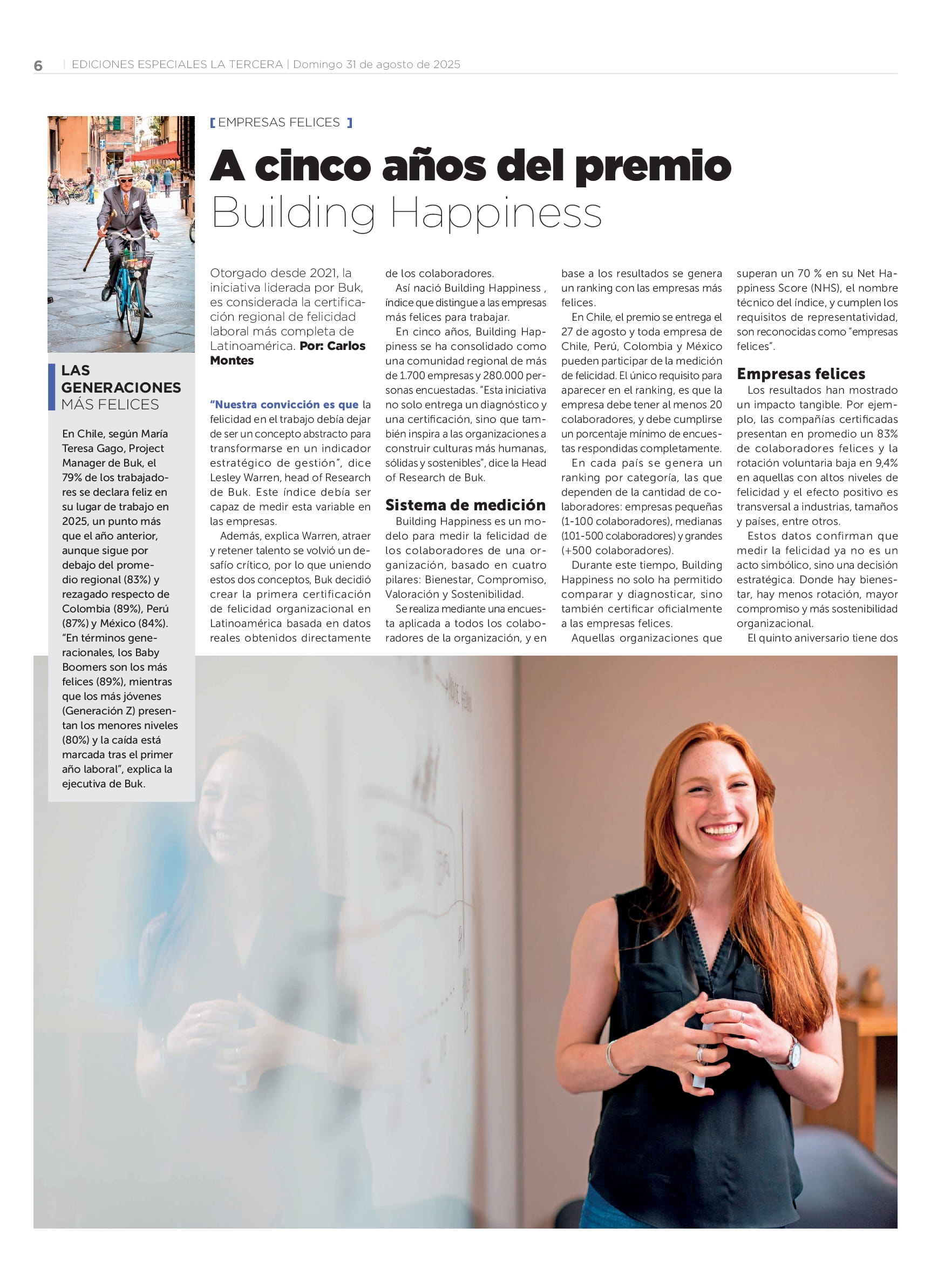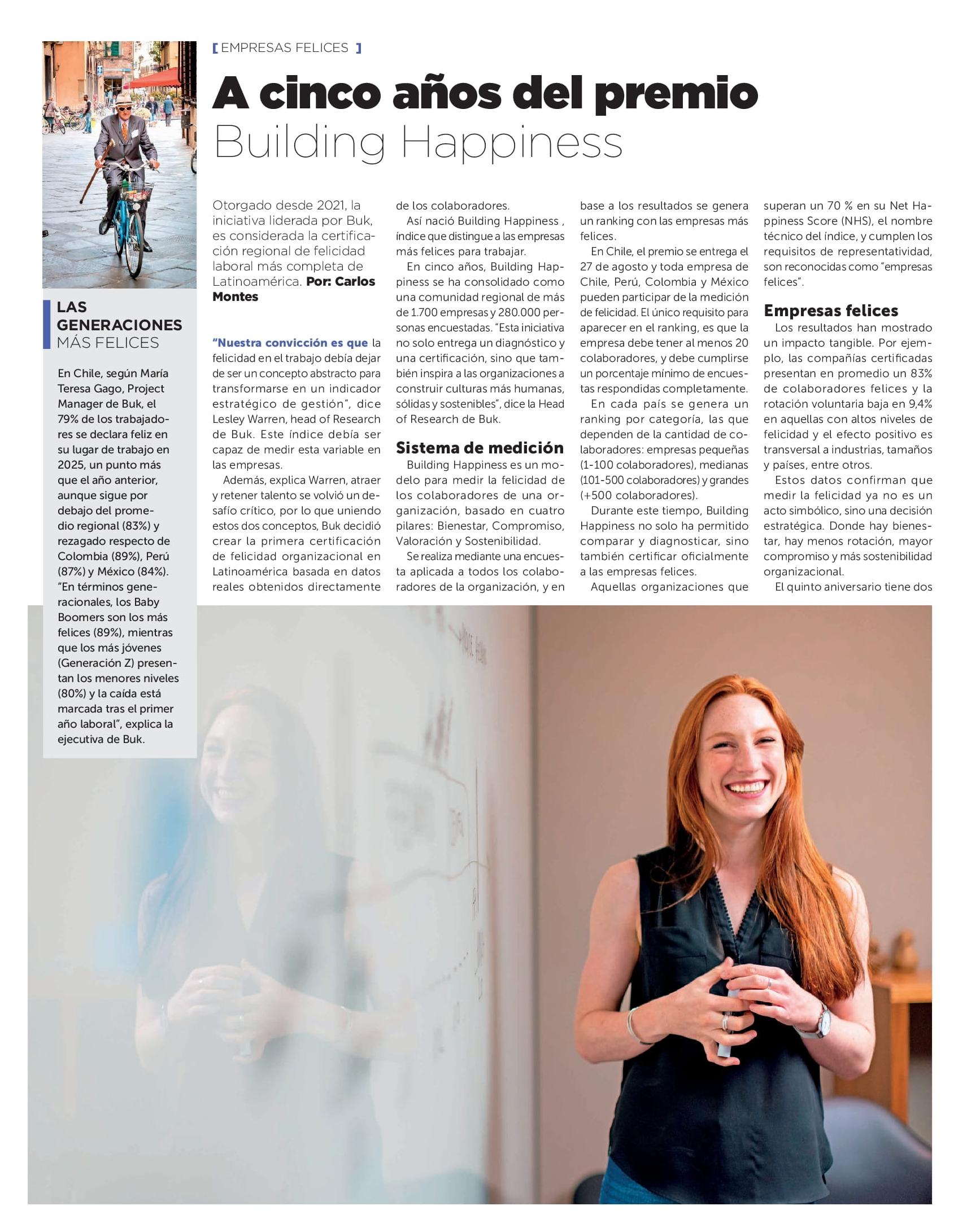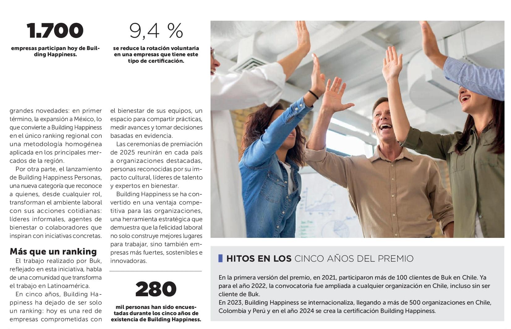 de los colaboradores. Así nació Building Happiness, índice que distingue a las empresas más felices para trabajar. En cinco años, Building Happiness se ha consolidado como una comunidad regional de más de 1.700 empresas y 280.000 personas encuestadas. “Esta iniciativa no solo entrega un diagnóstico y una certificación, sino que también inspira a las organizaciones a construir culturas más humanas, sólidas y sostenibles”, dice la Head of Research de Buk.