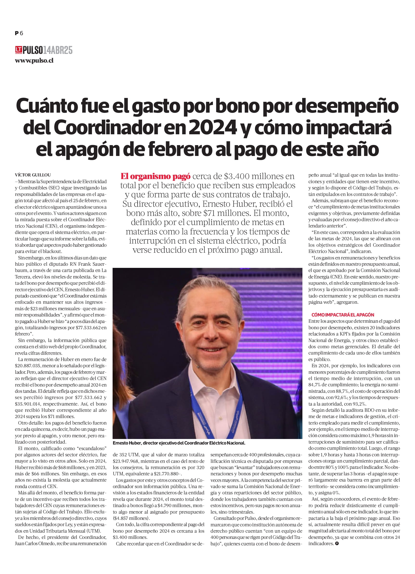 El monto, calificado como "escandaloso" por algunos actores del sector eléctrico, fue mayor a lo visto en otros años. Solo en 2024, Huber recibió más de $68 millones, y en 2023, más de $66 millones. Sin embargo, en esos años no existía la molestia que actualmente ronda contra el CEN.