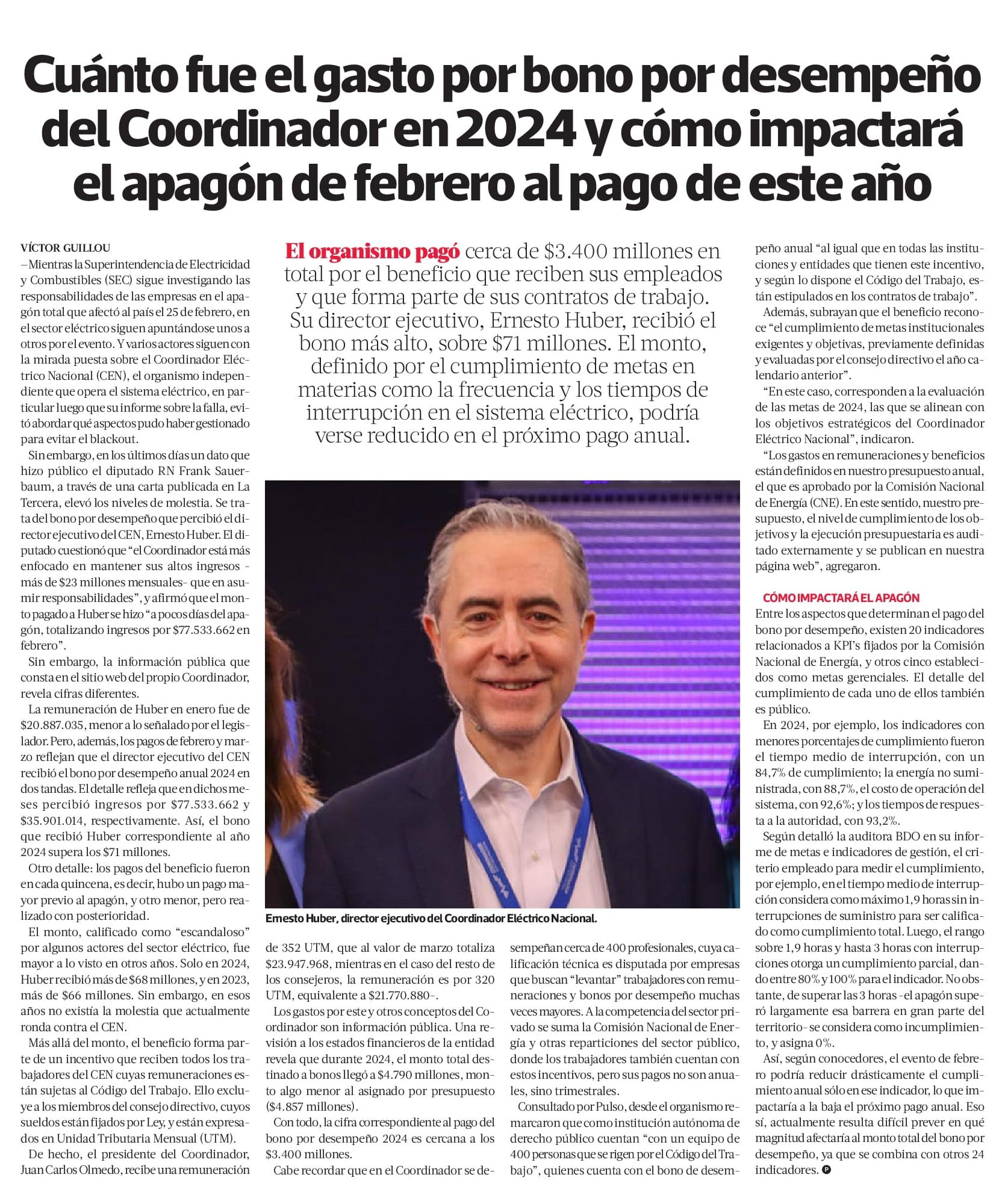 Sin embargo, en los últimos días un dato que hizo público el diputado RN Frank Sauerbaum, a través de una carta publicada en La Tercera, elevó los niveles de molestia. Se trata del bono por desempeño que percibió el director ejecutivo del CEN, Ernesto Huber. El diputado cuestionó que "el Coordinador está más enfocado en mantener sus altos ingresos -más de $23 millones mensuales- que en asumir responsabilidades", y afirmó que el monto pagado a Huber se hizo "a pocos días del apagón, totalizando ingresos por $77.533.662 en febrero".