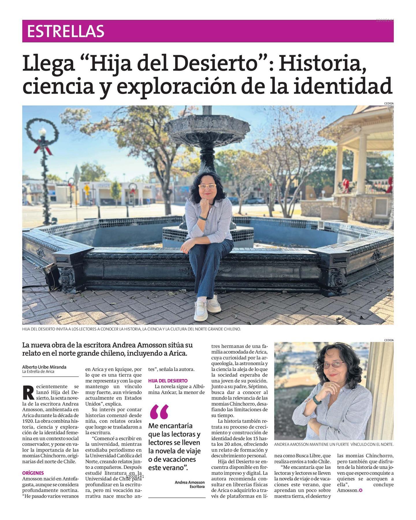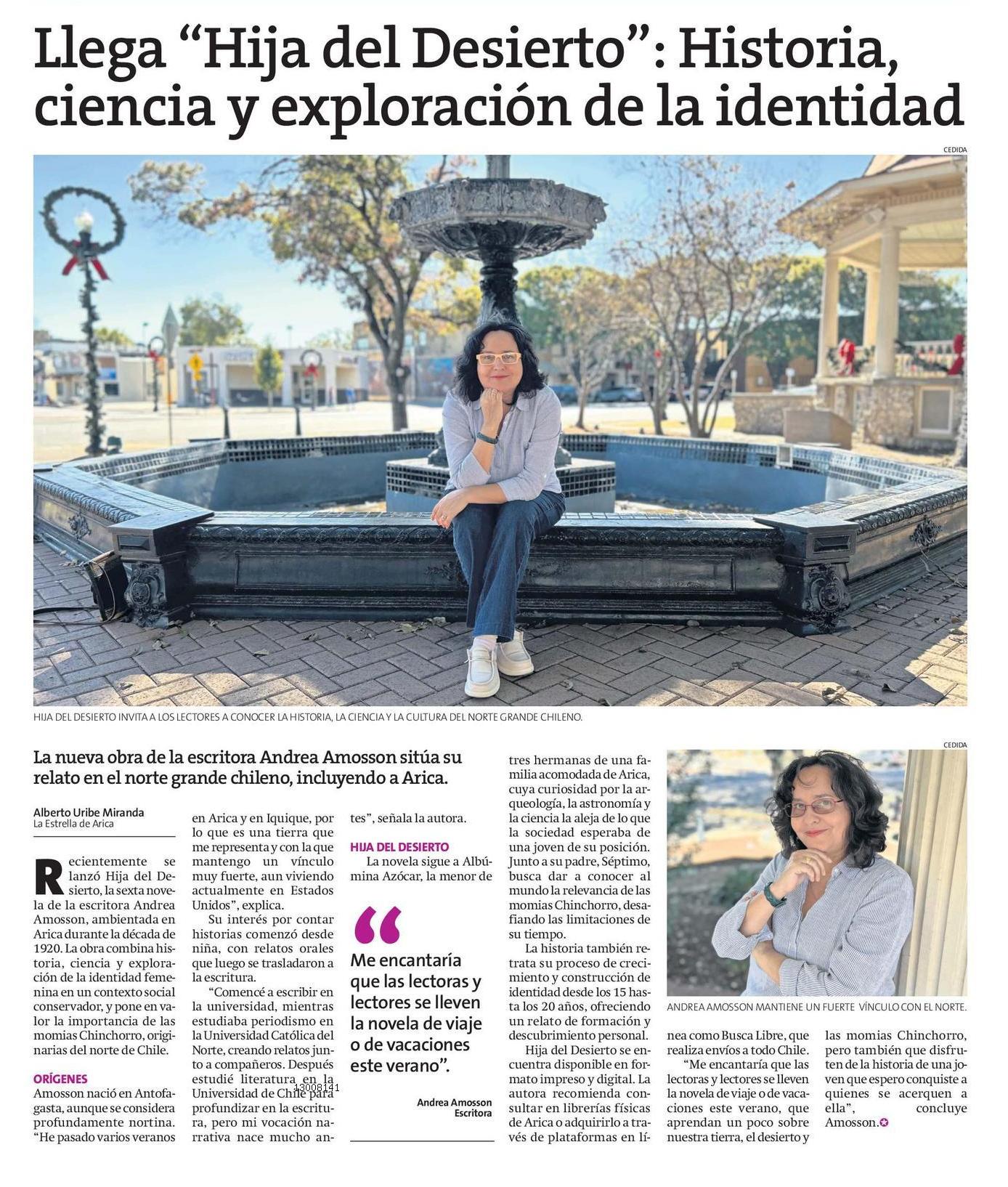 La nueva obra de la escritora Andrea Amosson sitúa su relato en el norte grande chileno, incluyendo a Arica. ecientemente — se lanzó Hija del Desierto, la sexta nove la de la escritora Andrea Amosson, ambientada en Arica durante la década de 1920. La obra combina historia, ciencia y explora¡ón de la identidad femenina en un contexto social conservador, y pone en valor la importancia de las momias Chinchorro, originarias del norte de Chile