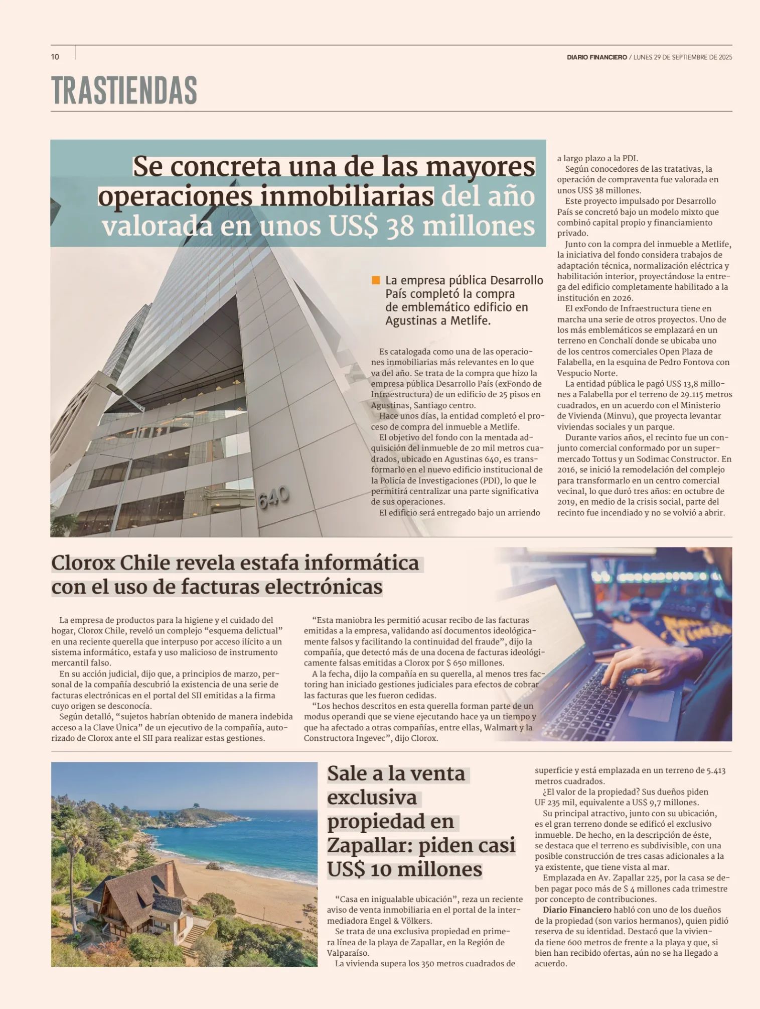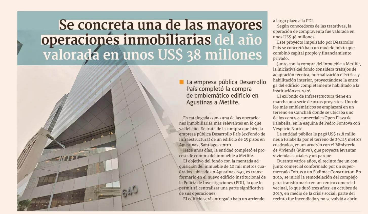 Es catalogada como una de las operaciones inmobiliarias más relevantes en lo que va del año. Se trata de la compra que hizo la empresa pública Desarrollo País (exFondo de Infraestructura) de un edificio de 25 pisos en Agustinas, Santiago centro.