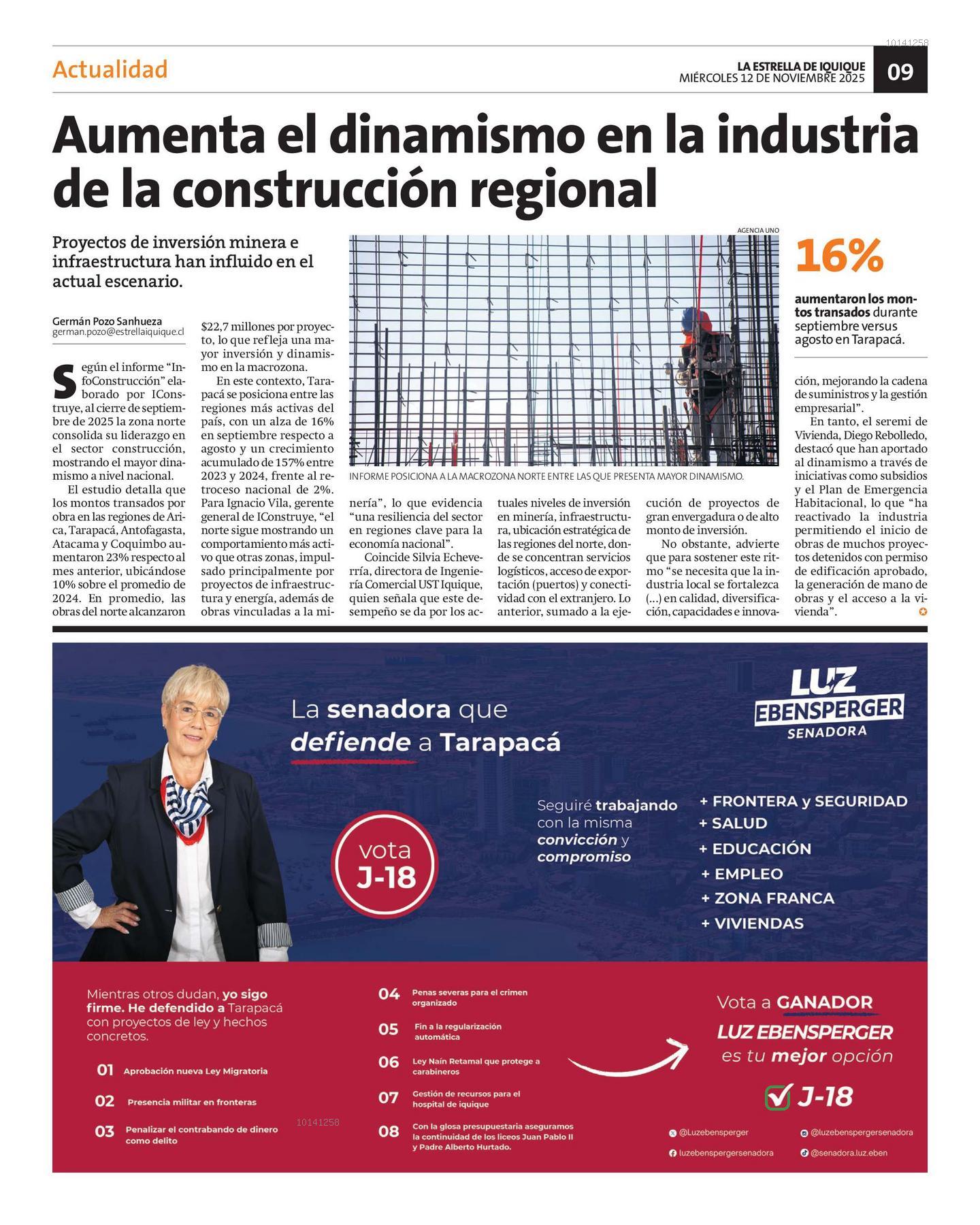 Proyectos de inversión minera e infraestructura han influido en el actual escenario. egún el informe In foConstrucción" ela borado pOr ICons-Huye, al cierre de sepuembre de 2025 la zona norte consolida su liderazgo en el sector construcción, mostrando el mayor dinamismo a nivel nacional. El estudio detalla que los montos transados por Obra en las regiones de Arica, Tarapacá, Antofagasta, Atacama y Coquimbo aumentaron 23% respecto al mes anterior, ubicándose 10% sobre el promedio de 2024. En promedio, las obras del norte alcanzaron $22,7 millones por proyecto, lo que refleja una mayor inversión y dinamismo en la macrozona