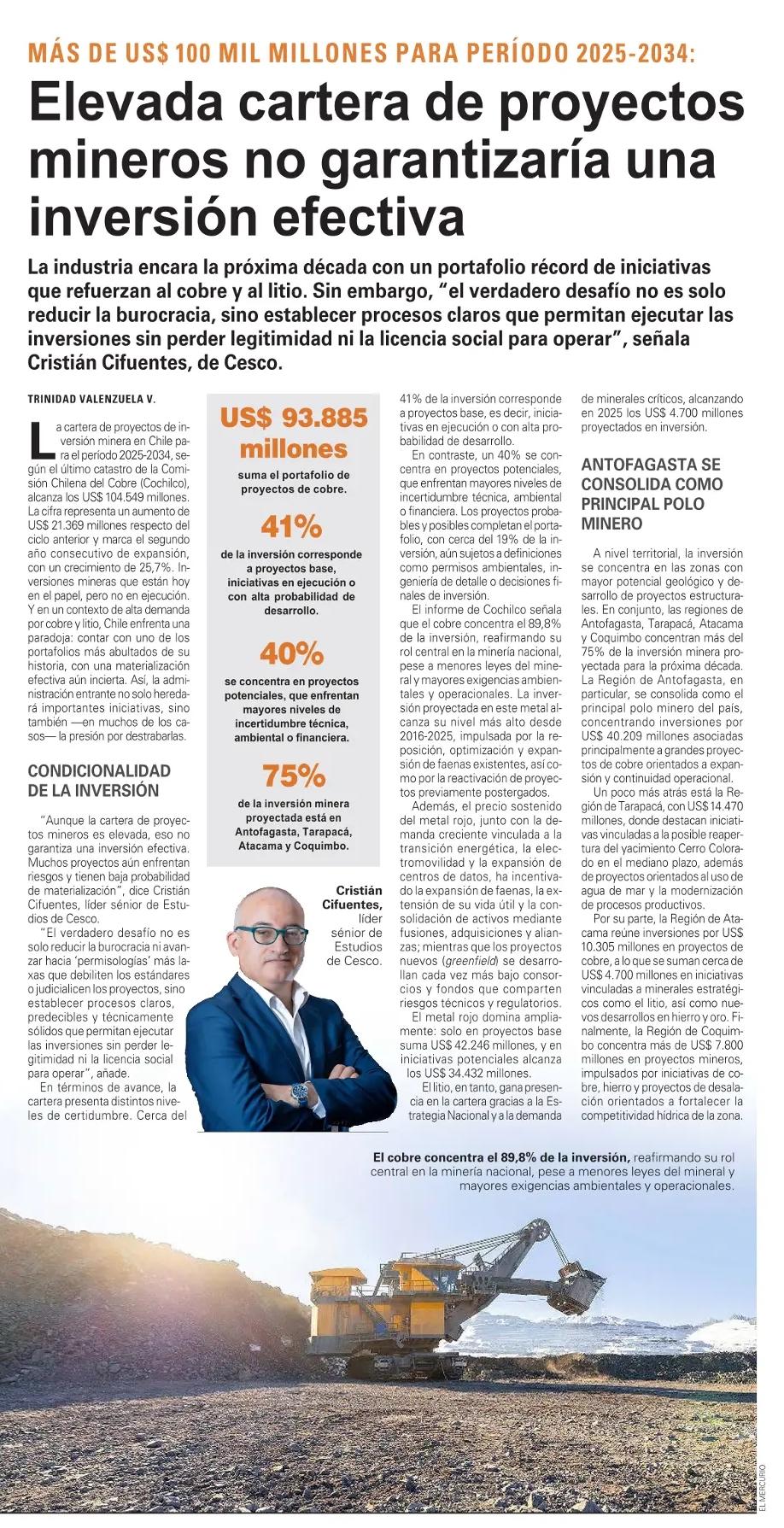 “Aunque la cartera de proyectos mineros es elevada, eso no garantiza una inversión efectiva. Muchos proyectos aún enfrentan riesgos y tienen baja probabilidad de materialización”, dice Cristián Cifuentes, líder sénior de Estudios de Cesco.