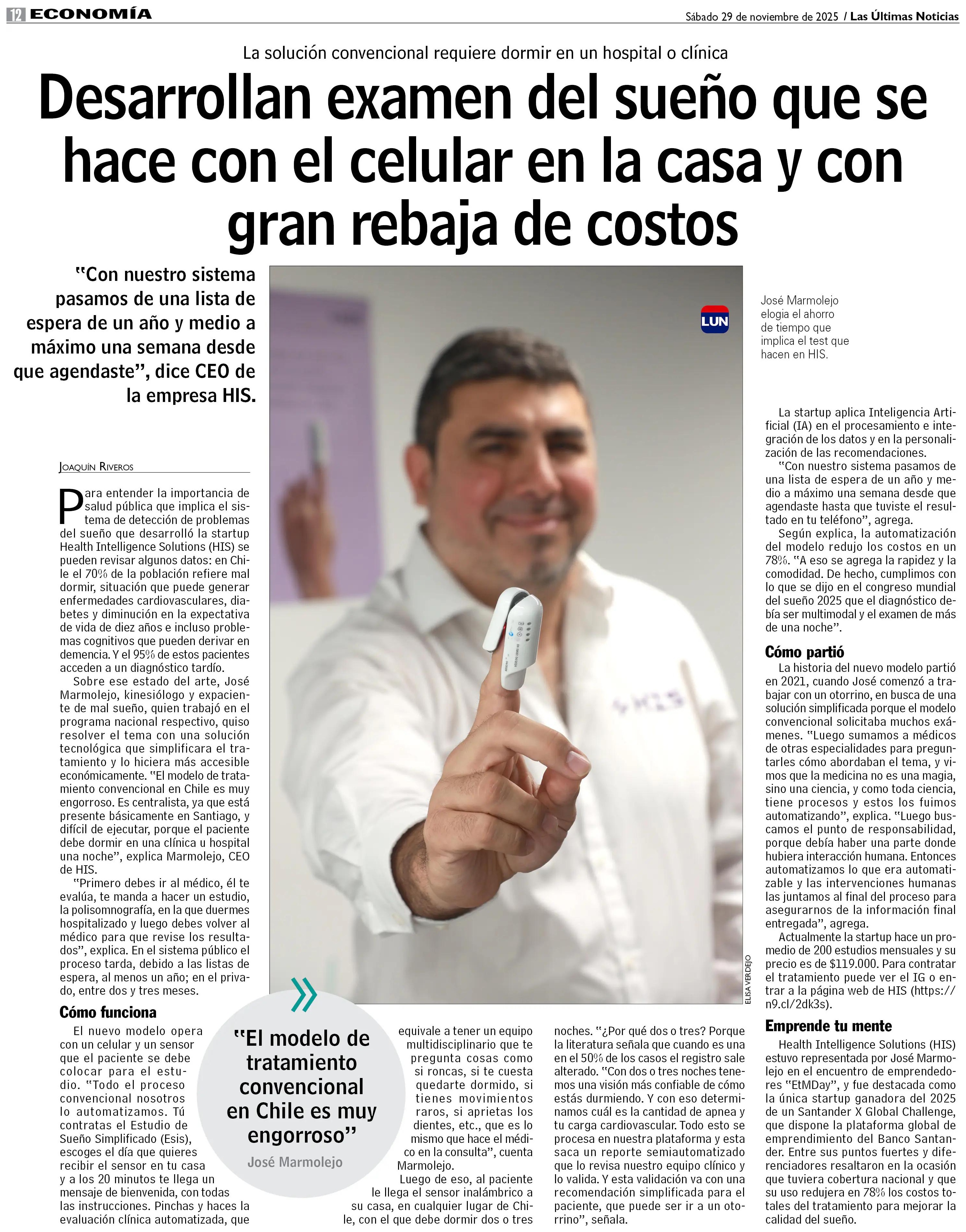 Health Intelligence Solutions (HIS) estuvo representada por José Marmolejo en el encuentro de emprendedores “EtMDay”, y fue destacada como la única startup ganadora del 2025 de un Santander X Global Challenge, que dispone la plataforma global de emprendimiento del Banco Santander. Entre sus puntos fuertes y diferenciadores resaltaron en la ocasión que tuviera cobertura nacional y que su uso redujera en 78% los costos totales del tratamiento para mejorar la calidad del sueño.