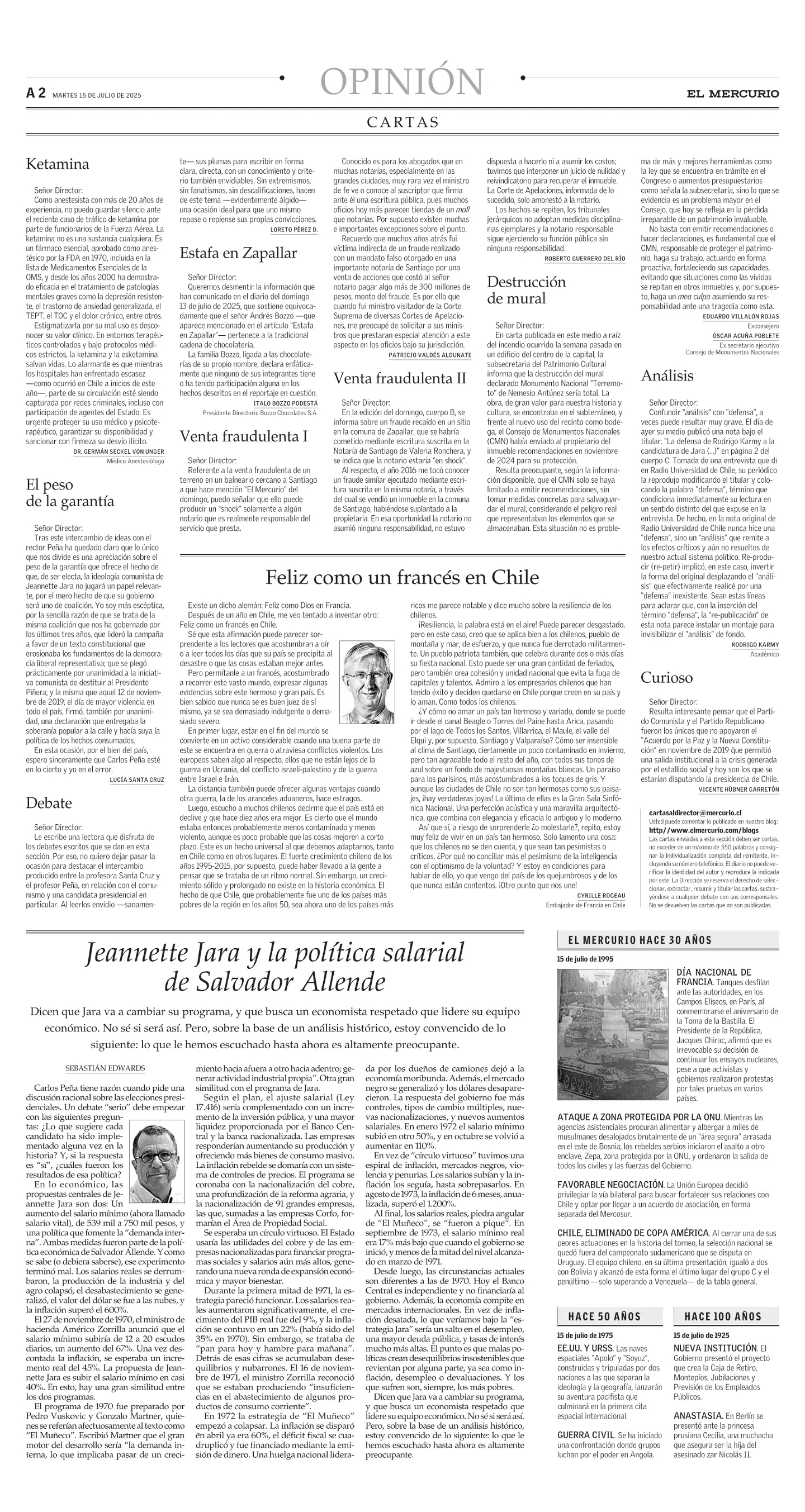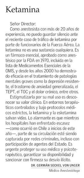 Señor Director: Como anestesista con más de 20 años de experiencia, no puedo guardar silencio ante el reciente caso de tráfico de ketamina por parte de funcionarios de la Fuerza Aérea. La ketamina no es una sustancia cualquiera. Es un fármaco esencial, aprobado como anestésico por la FDA en 1970, incluida en la lista de Medicamentos Esenciales de la OMS, y desde los años 2000 ha demostrado eficacia en el tratamiento de patologías mentales graves como la depresión resistente, el trastorno de ansiedad generalizada, el TEPT, el TOC y el dolor crónico, entre otros. Estigmatizarla por su mal uso es desconocer su valor clínico. En entornos terapéuticos controlados y bajo protocolos médicos estrictos, la ketamina y la esketamina salvan vidas. Lo alarmante es que mientras los hospitales han enfrentado escasez —como ocurrió en Chile a inicios de este año—, parte de su circulación esté siendo capturada por redes criminales, incluso con participación de agentes del Estado. Es urgente proteger su uso médico y psicoterapéutico, garantizar su disponibilidad y sancionar con firmeza su desvío ilícito. Dr. Germán Seckel von Unger Médico Anestesiólogo