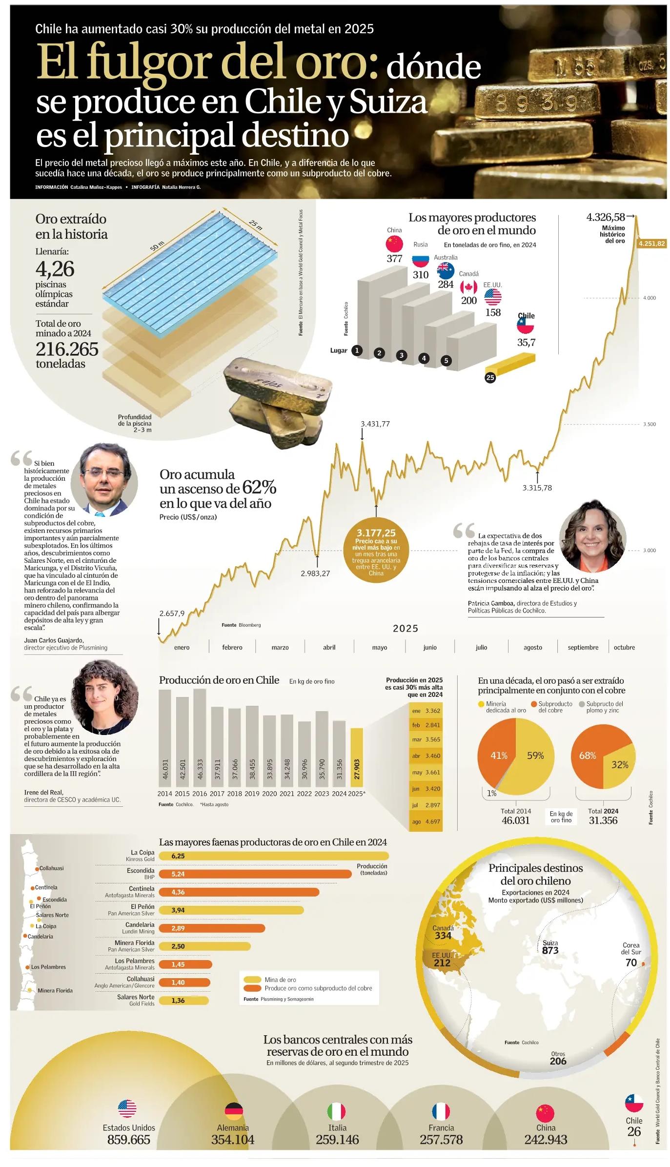 El precio del metal precioso llegó a máximos este año. En Chile, y a diferencia de lo que sucedía hace una década, el oro se produce principalmente como un subproducto del cobre. INFORMACIÓN Catalina Muñoz-Kapnes • INFOGRAFÍA Natalia Herrera G.