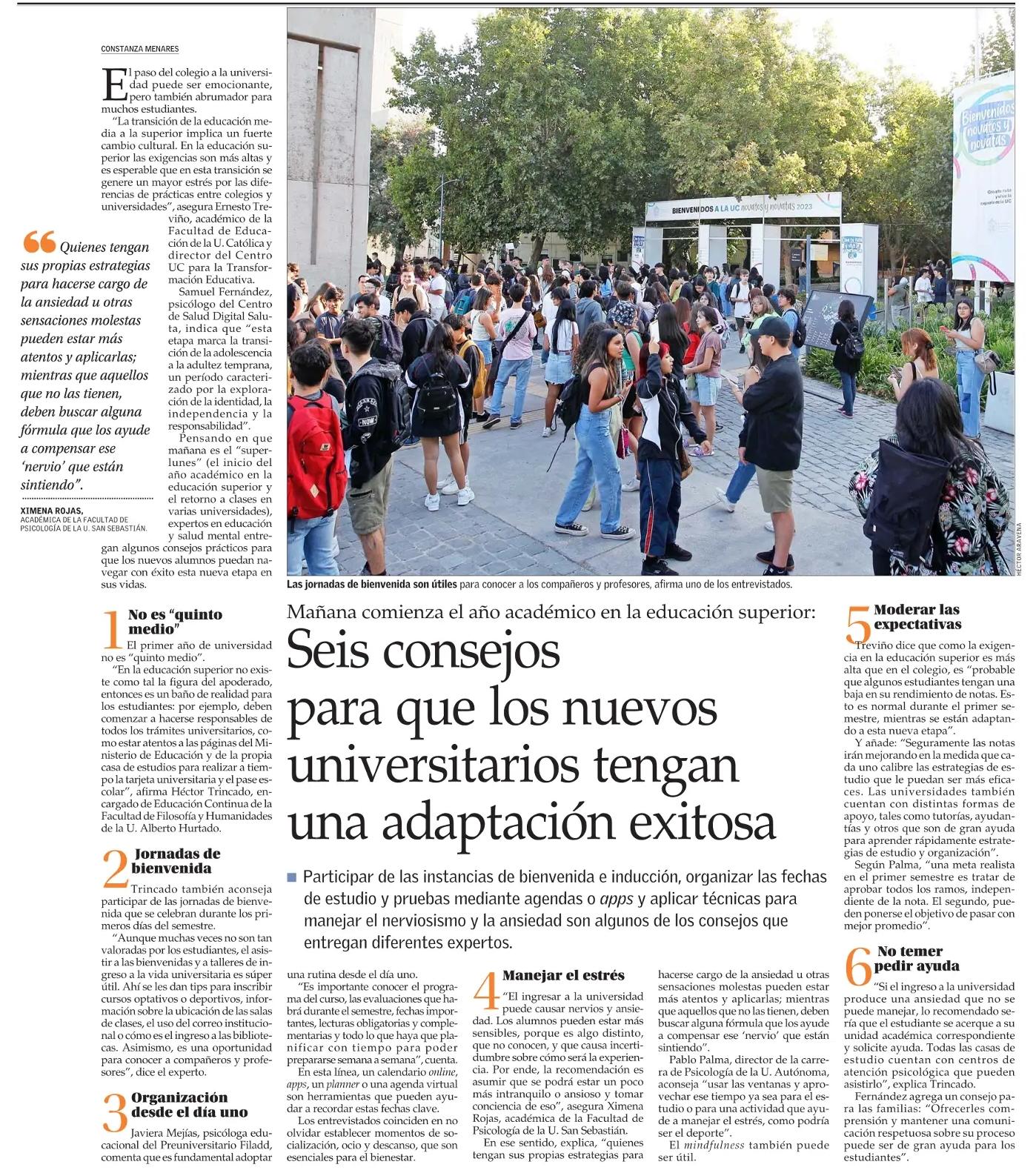“En la educación superior no existe como tal la figura del apoderado, entonces es un baño de realidad para los estudiantes: por ejemplo, deben comenzar a hacerse responsables de todos los trámites universitarios, como estar atentos a las páginas del Ministerio de Educación y de la propia casa de estudios para realizar a tiempo la tarjeta universitaria y el pase escolar”, afirma Héctor Trincado, encargado de Educación Continua de la Facultad de Filosofía y Humanidades de la U. Alberto Hurtado.