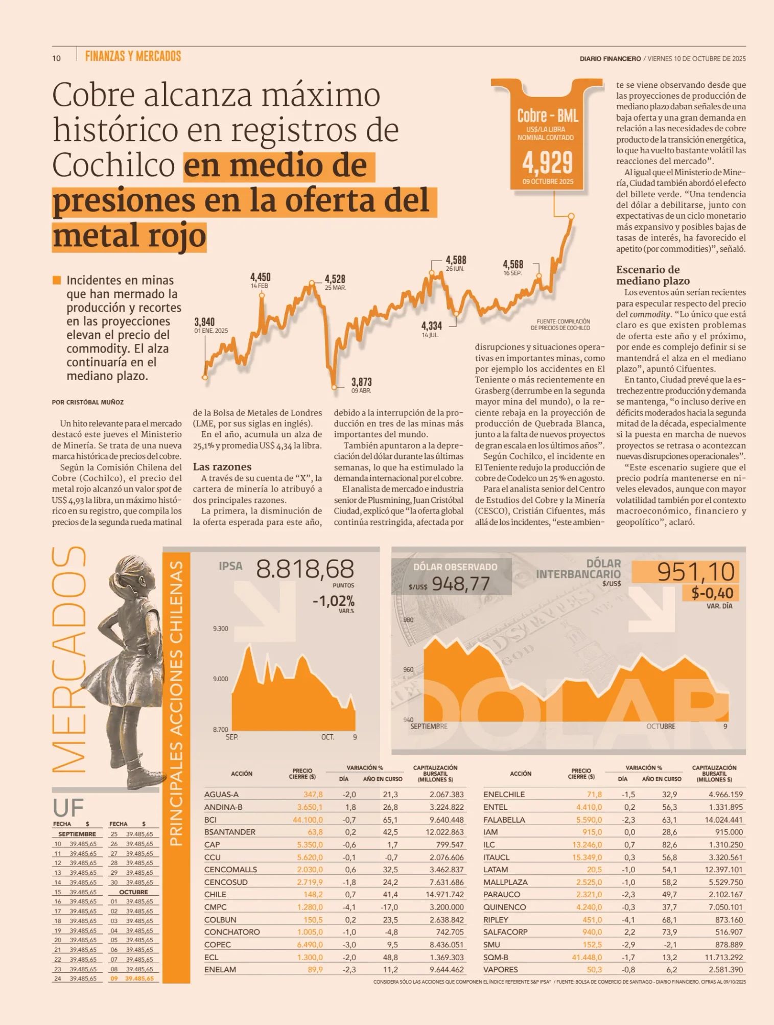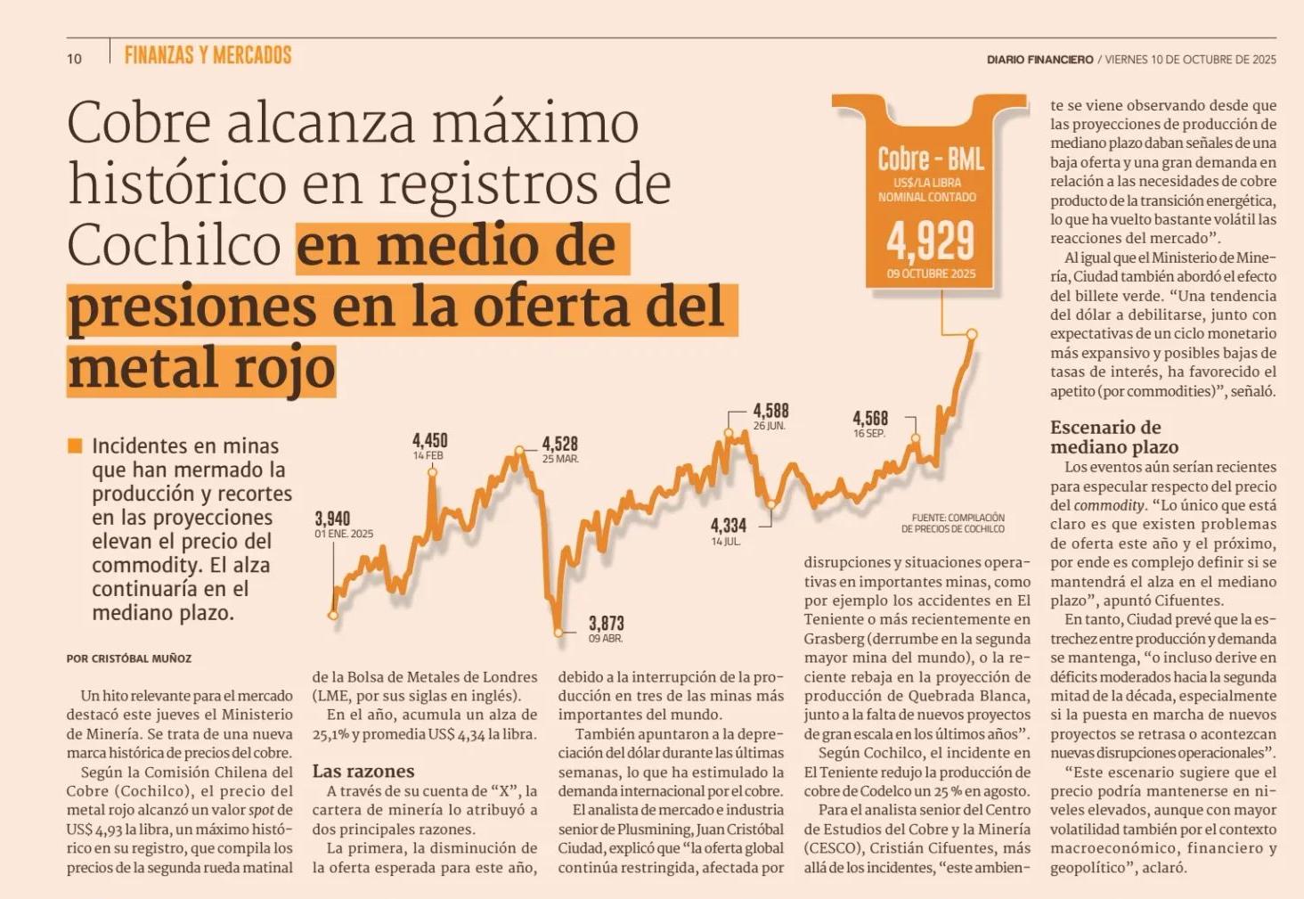 El analista de mercado e industria senior de Plusmining, Juan Cristóbal Ciudad, explicó que “la oferta global continúa restringida, afectada por disrupciones y situaciones operativas en importantes minas, como por ejemplo los accidentes en El Teniente o más recientemente en Grasberg (derrumbe en la segunda mayor mina del mundo), o la reciente rebaja en la proyección de producción de Quebrada Blanca, junto a la falta de nuevos proyectos de gran escala en los últimos años”.