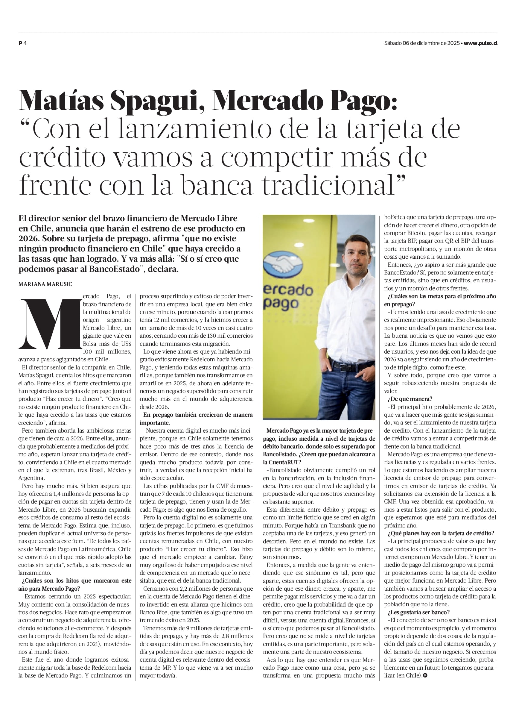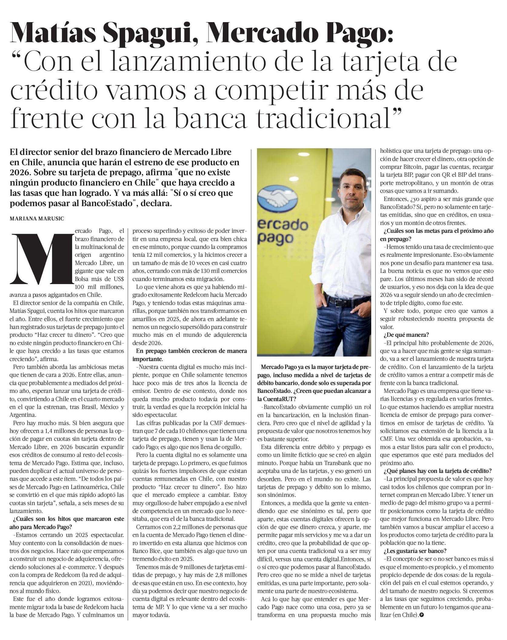 El director senior del brazo financiero de Mercado Libre en Chile, anuncia que harán el estreno de ese producto en 2026. Sobre su tarjeta de prepago, afirma "que no existe ningún producto financiero en Chile" que haya crecido a las tasas que han logrado. Y va más allá: "Sí o sí creo que podemos pasar al BancoEstado", declara.