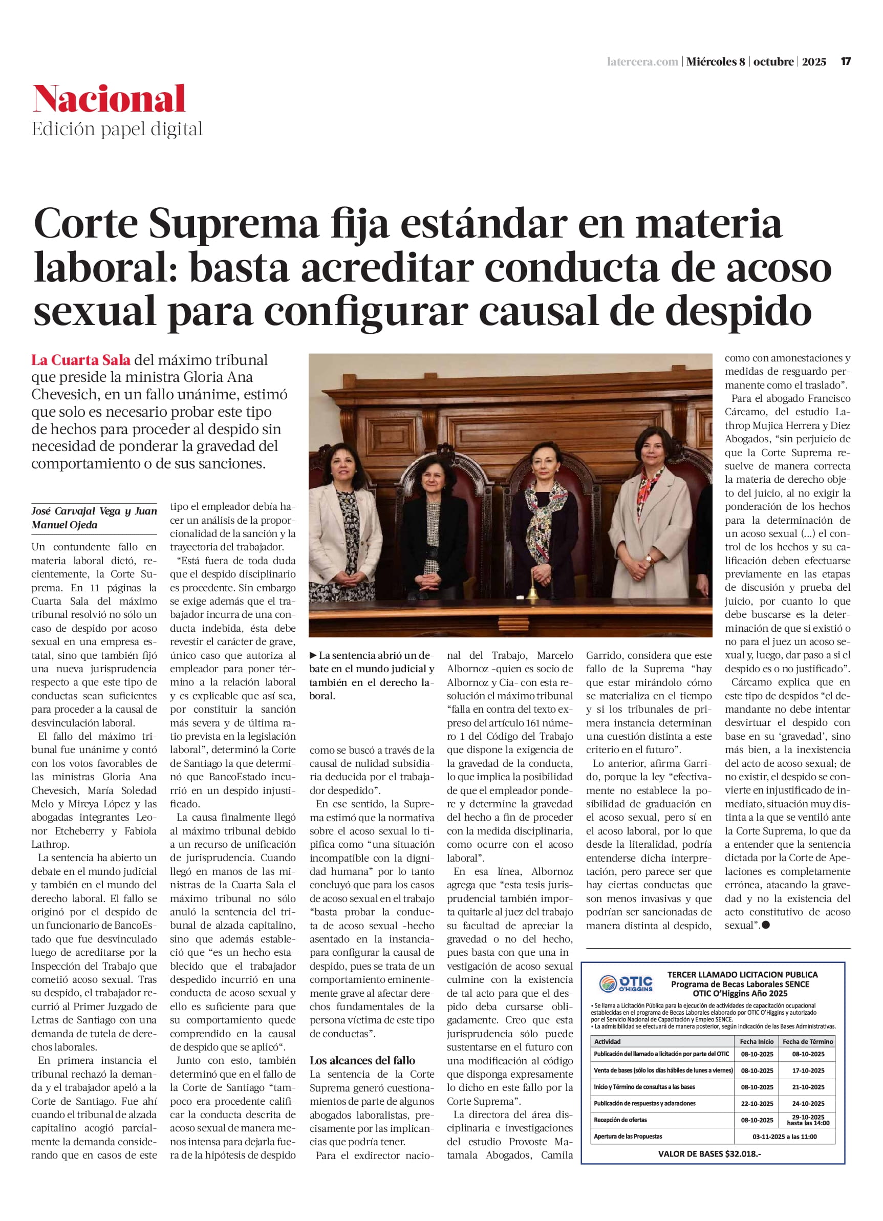 La directora del área disciplinaria e investigaciones del estudio Provoste Matamala Abogados, Camila Garrido, considera que este fallo de la Suprema “hay que estar mirándolo cómo se materializa en el tiempo y si los tribunales de primera instancia determinan una cuestión distinta a este criterio en el futuro”.