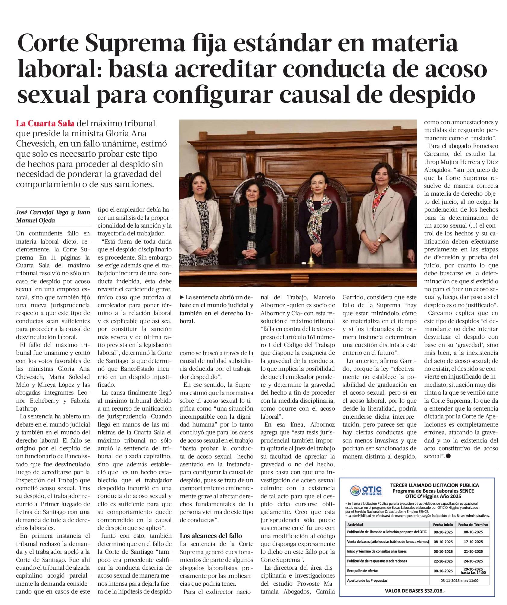 Un contundente fallo en materia laboral dictó, recientemente, la Corte Suprema. En 11 páginas la Cuarta Sala del máximo tribunal resolvió no sólo un caso de despido por acoso sexual en una empresa estatal, sino que también fijó una nueva jurisprudencia respecto a que este tipo de conductas sean suficientes para proceder a la causal de desvinculación laboral.