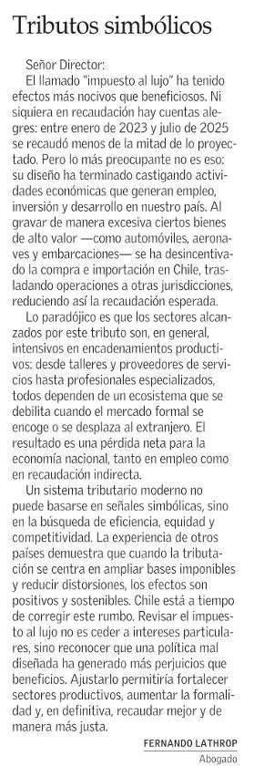 Señor Director: El llamado “impuesto al lujo” ha tenido efectos más nocivos que beneficiosos. Ni siquiera en recaudación hay cuentas alegres: entre enero de 2023 y julio de 2025 se recaudó menos de la mitad de lo proyectado. Pero lo más preocupante no es eso: su diseño ha terminado castigando actividades económicas que generan empleo, inversión y desarrollo en nuestro país. Al gravar de manera excesiva ciertos bienes de alto valor —como automóviles, aeronaves y embarcaciones— se ha desincentivado la compra e importación en Chile, trasladando operaciones a otras jurisdicciones, reduciendo así la recaudación esperada. Lo paradójico es que los sectores alcanzados por este tributo son, en general, intensivos en encadenamientos productivos: desde talleres y proveedores de servicios hasta profesionales especializados, todos dependen de un ecosistema que se debilita cuando el mercado formal se encoge o se desplaza al extranjero. El resultado es una pérdida neta para la economía nacional, tanto en empleo como en recaudación indirecta. Un sistema tributario moderno no puede basarse en señales simbólicas, sino en la búsqueda de eficiencia, equidad y competitividad. La experiencia de otros países demuestra que cuando la tributación se centra en ampliar bases imponibles y reducir distorsiones, los efectos son positivos y sostenibles. Chile está a tiempo de corregir este rumbo. Revisar el impuesto al lujo no es ceder a intereses particulares, sino reconocer que una política mal diseñada ha generado más perjuicios que beneficios. Ajustarlo permitiría fortalecer sectores productivos, aumentar la formalidad y, en definitiva, recaudar mejor y de manera más justa. Fernando Lathrop Abogado