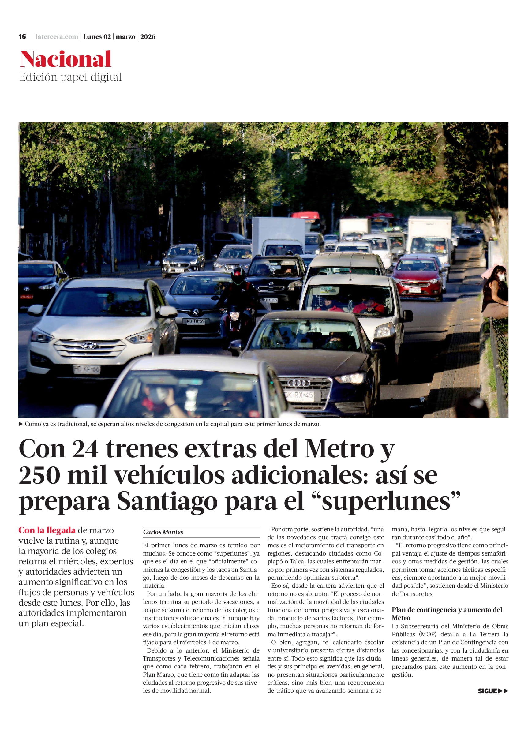Plan de contingencia y aumento del Metro La Subsecretaría del Ministerio de Obras Públicas (MOP) detalla a La Tercera la existencia de un Plan de Contingencia con las concesionarias, y con la ciudadanía en líneas generales, de manera tal de estar preparados para este aumento en la congestión.