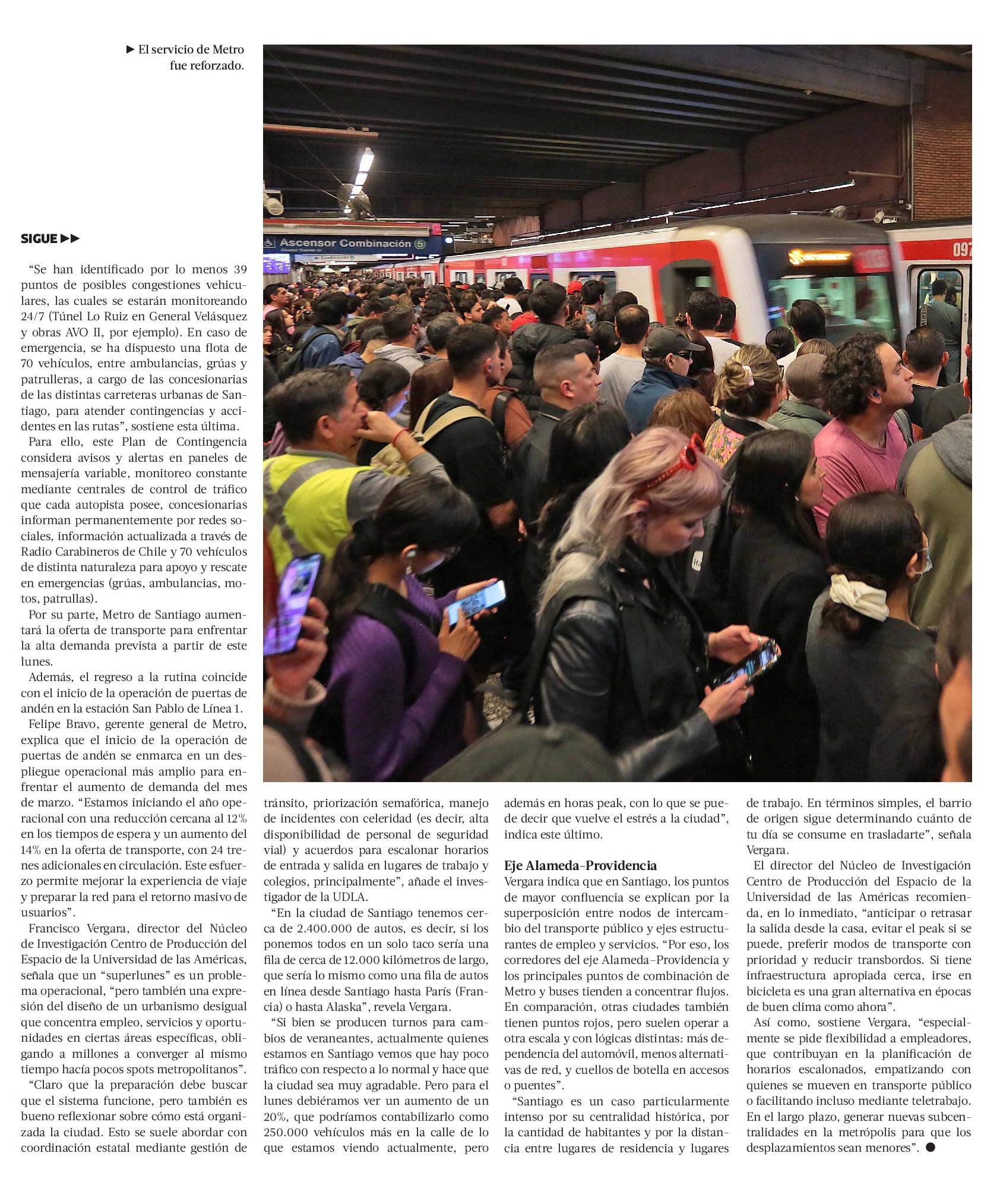 “Se han identificado por lo menos 39 puntos de posibles congestiones vehiculares, las cuales se estarán monitoreando 24/7 (Túnel Lo Ruiz en General Velásquez y obras AVO II, por ejemplo). En caso de emergencia, se ha dispuesto una flota de 70 vehículos, entre ambulancias, grúas y patrulleras, a cargo de las concesionarias de las distintas carreteras urbanas de Santiago, para atender contingencias y accidentes en las rutas”, sostiene esta última. Para ello, este Plan de Contingencia considera avisos y alertas en paneles de mensajería variable, monitoreo constante mediante centrales de control de tráfico que cada autopista posee, concesionarias informan permanentemente por redes sociales, información actualizada a través de Radio Carabineros de Chile y 70 vehículos de distinta naturaleza para apoyo y rescate en emergencias (grúas, ambulancias, motos, patrullas). Por su parte, Metro de Santiago aumentará la oferta de transporte para enfrentar la alta demanda prevista a partir de este lunes. Además, el regreso a la rutina coincide con el inicio de la operación de puertas de andén en la estación San Pablo de Línea 1. Felipe Bravo, gerente general de Metro, explica que el inicio de la operación de puertas de andén se enmarca en un despliegue operacional más amplio para enfrentar el aumento de demanda del mes de marzo. “Estamos iniciando el año operacional con una reducción cercana al 12% en los tiempos de espera y un aumento del 14% en la oferta de transporte, con 24 trenes adicionales en circulación. Este esfuerzo permite mejorar la experiencia de viaje y preparar la red para el retorno masivo de usuarios”. Francisco Vergara, director del Núcleo de Investigación Centro de Producción del Espacio de la Universidad de las Américas, señala que un “superlunes” es un problema operacional, “pero también una expresión del diseño de un urbanismo desigual que concentra empleo, servicios y oportunidades en ciertas áreas específicas, obligando a millones a converger al mismo tiempo hacia pocos spots metropolitanos”.