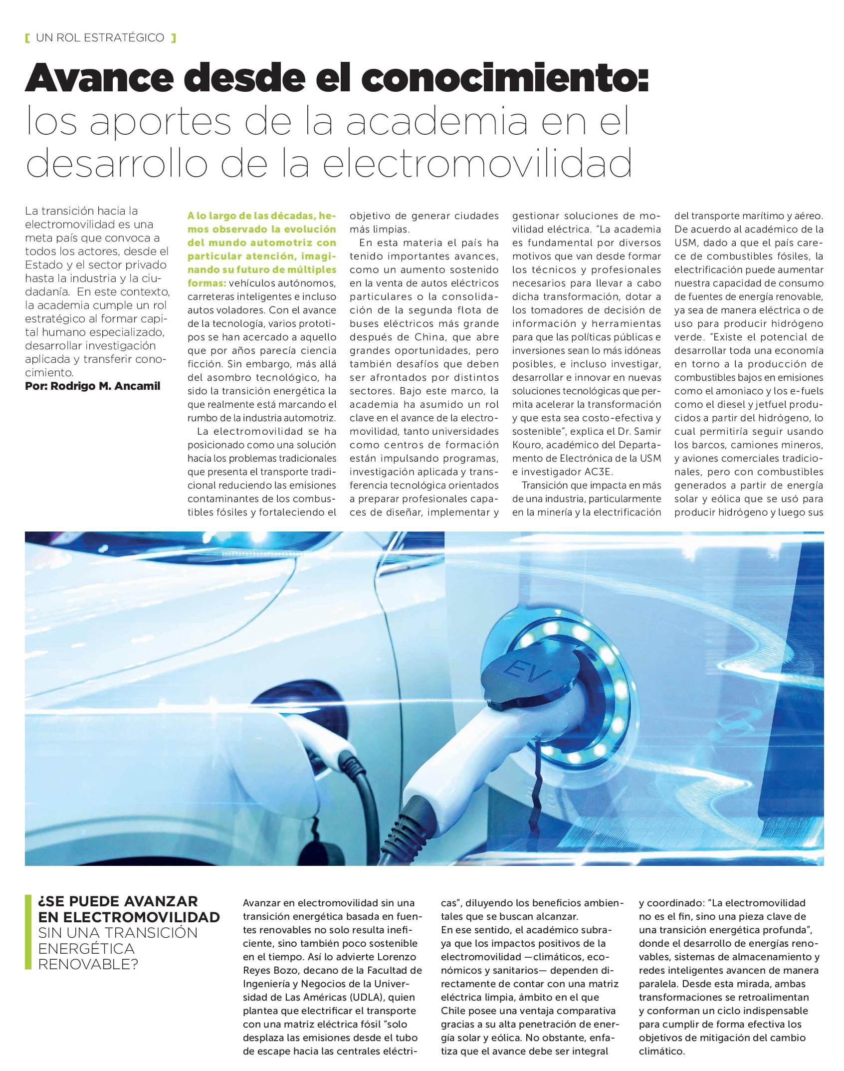 La electromovilidad se ha posicionado como una solución hacia los problemas tradicionales que presenta el transporte tradicional reduciendo las emisiones contaminantes de los combustibles fósiles y fortaleciendo el objetivo de generar ciudades más limpias En esta materia el país ha tenido importantes avances, como un aumento sostenido en la venta de autos eléctricos particulares o la consolidación de la segunda flota de buses eléctricos más grande después de China, que abre grandes oportunidades, pero también desafíos que deben ser afrontados por distintos sectores. Bajo este marco, la academia ha asumido un rol clave en el avance de la electromovilidad, tanto universidades como centros de formación están impulsando programas, investigación aplicada y transferencia tecnológica orientados a preparar profesionales capaces de diseñar, implementar y gestionar soluciones de movilidad eléctrica. "La academia es fundamental por diversos motivos que van desde formar los técnicos y profesionales necesarios para llevar a cabo dicha transformación, dotar a los tomadores de decisión de información y herramientas para que las políticas públicas e inversiones sean lo más idóneas posibles, e incluso investigar, desarrollar e innovar en nuevas soluciones tecnológicas que permita acelerar la transformación y que esta sea costo-efectiva y sostenible”, explica el Dr.