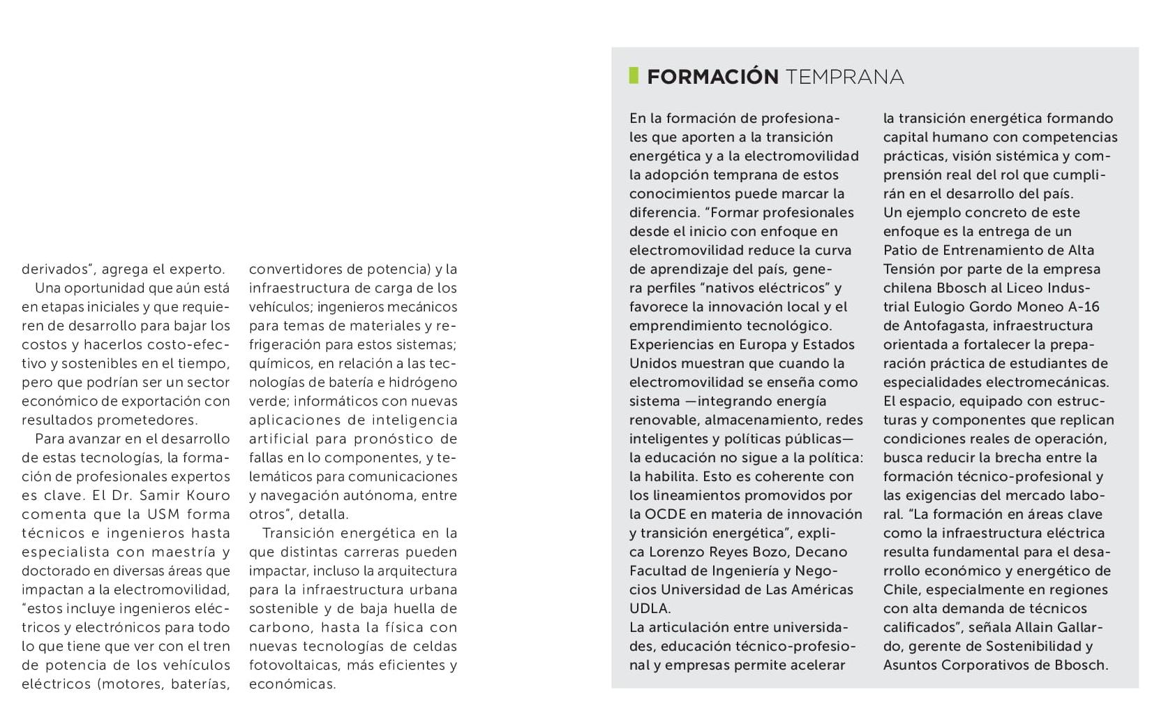 Desde esta mirada, ambas transformaciones se retroalimentan y conforman un ciclo indispensable para cumplir de forma efectiva los objetivos de mitigación del cambio climático. E FORMACIÓN TEMPRANA En la formación de profesionales que aporten a la tran n energética y a la electromovi la adopción temprana de estos conocimientos puede marcar la diferencia. “Formar profesionales desde el inicio con enfoque en electromovilidad reduce la curva de aprendizaje del país, gene ra perfiles “nativos eléctricos” y favorece la innovación local y el emprendimiento tecnológico.