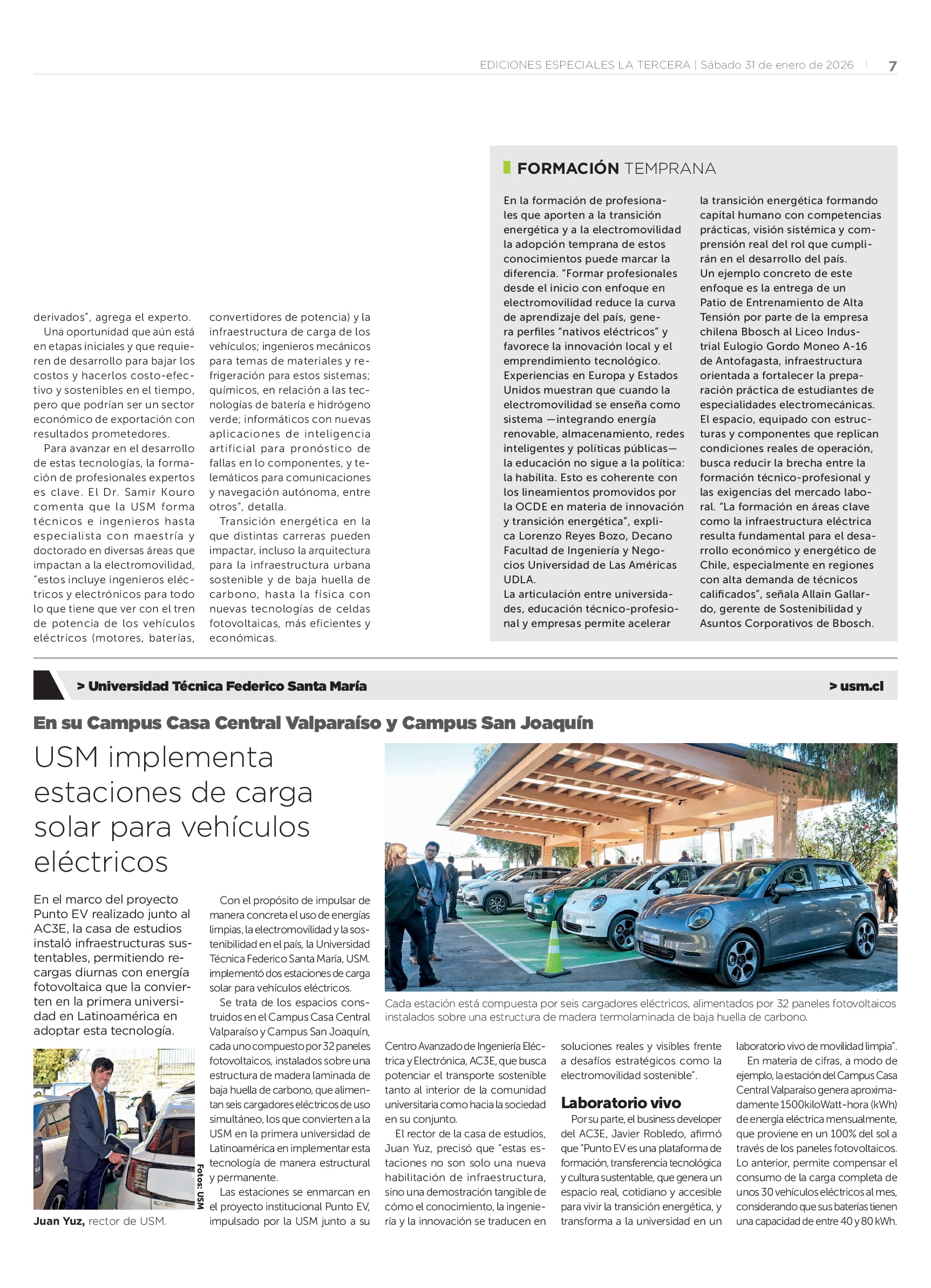 Una oportunidad que aún está en etapas iniciales y que requieren de desarrollo para bajar los costos y hacerlos costo-efectivo y sostenibles en el tiempo, pero que podrían ser un sector económico de exportación con resultados prometedores Para avanzar en el desarrollo de estas tecnologías, la formación de profesionales expertos es clave. El Dr. Samir Kouro comenta que la USM forma técnicos e ingenieros hasta especialista con maestría y doctorado en diversas áreas que impactan a la electromovilidad, “estos incluye ingenieros eléctricos y electrónicos para todo lo que tiene que ver con el tren de potencia de los vehículos eléctricos (motores, baterías, convertidores de potencia) y la infraestructura de carga de los vehículos ingenieros mecánicos para temas de materiales y refrigeración para estos sistemas químicos, en relación a las tecnologías de batería e hidrógeno verde informáticos con nuevas aplicaciones de inteligencia artificial para pronóstico de fallas en lo componentes, y telemáticos para comunicaciones y navegación autónoma, entre otros”, detalla Transición energética en la que distintas carreras pueden impactar, incluso la arquitectura para la infraestructura urbana sostenible y de baja huella de carbono, hasta la física con nuevas tecnologías de celdas fotovoltaicas, más eficientes y económicas. ¿SE PUEDE AVANZAR EN ELECTROMOVILIDAD SIN UNA TRANSICIÓN ENERGETICA RENOVABLE? Avanzar en electromovilidad sin una transición energética basada en fuentes renovables no solo resulta ineficiente, sino también poco sostenible en el tiempo.