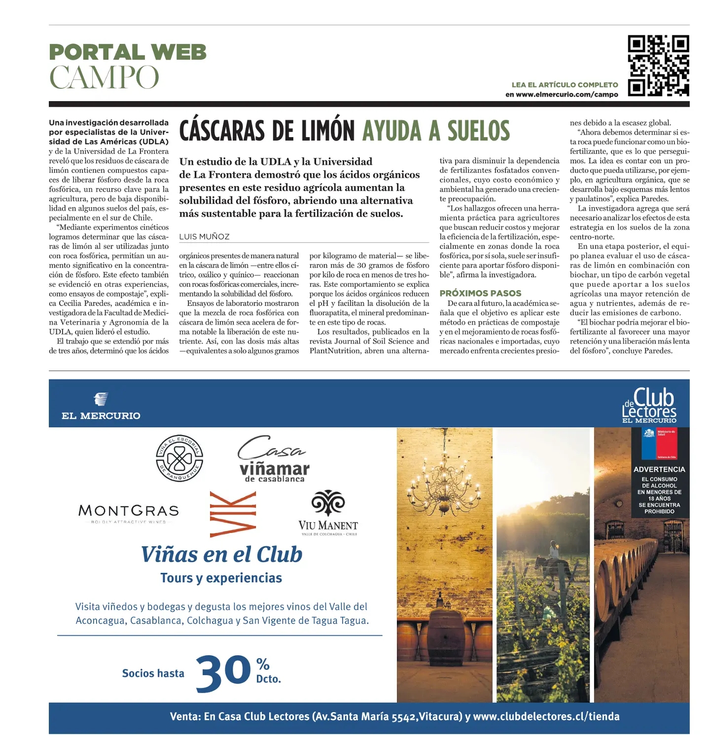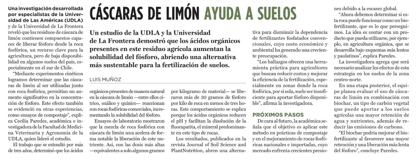Una investigación desarrollada por especialistas de la Universidad de Las Américas (UDLA) y de la Universidad de La Frontera reveló que los residuos de cáscara de limón contienen compuestos capaces de liberar fósforo desde la roca fosfórica, un recurso clave para la agricultura, pero de baja disponibilidad en algunos suelos del país, especialmente en el sur de Chile.