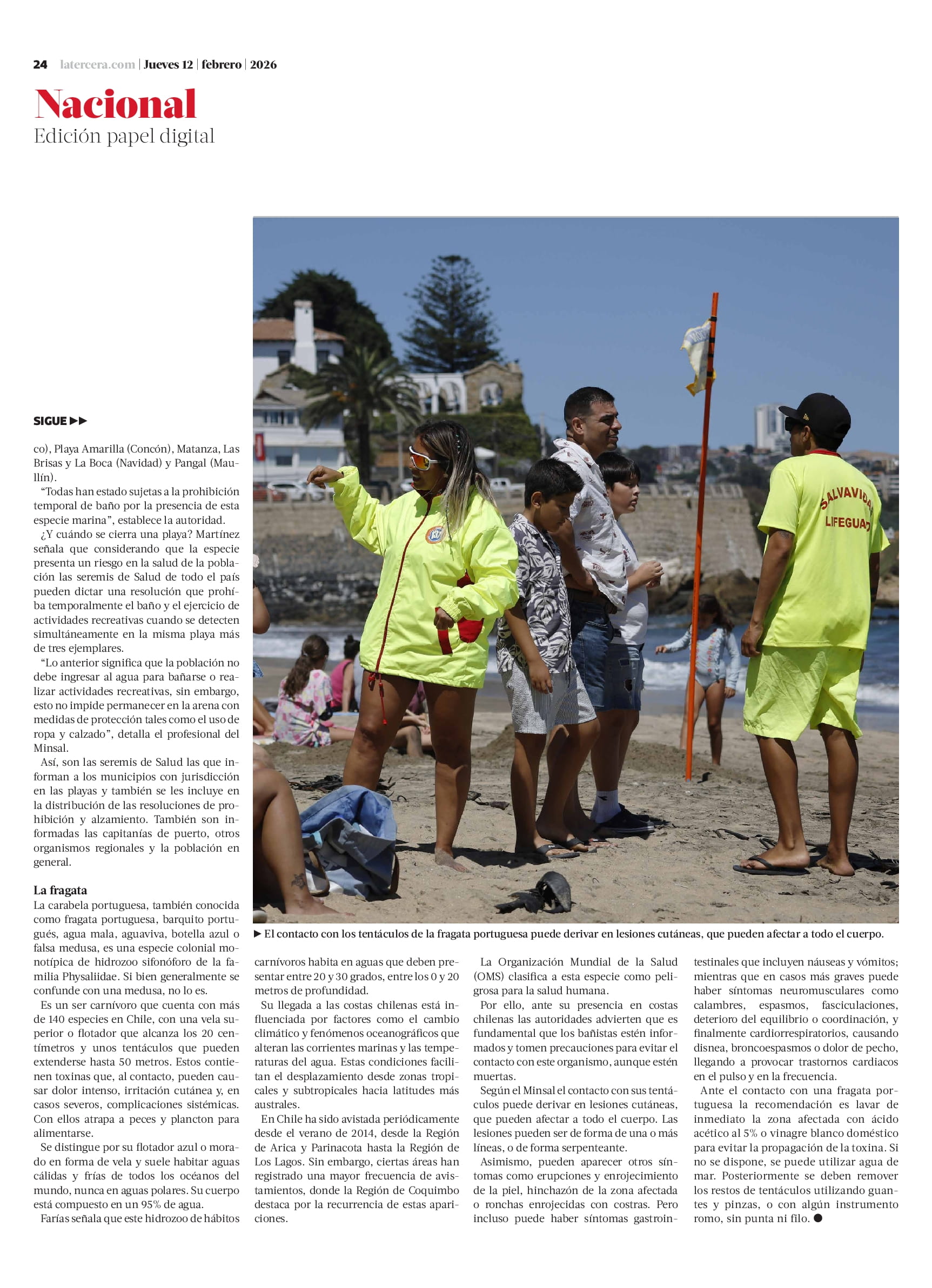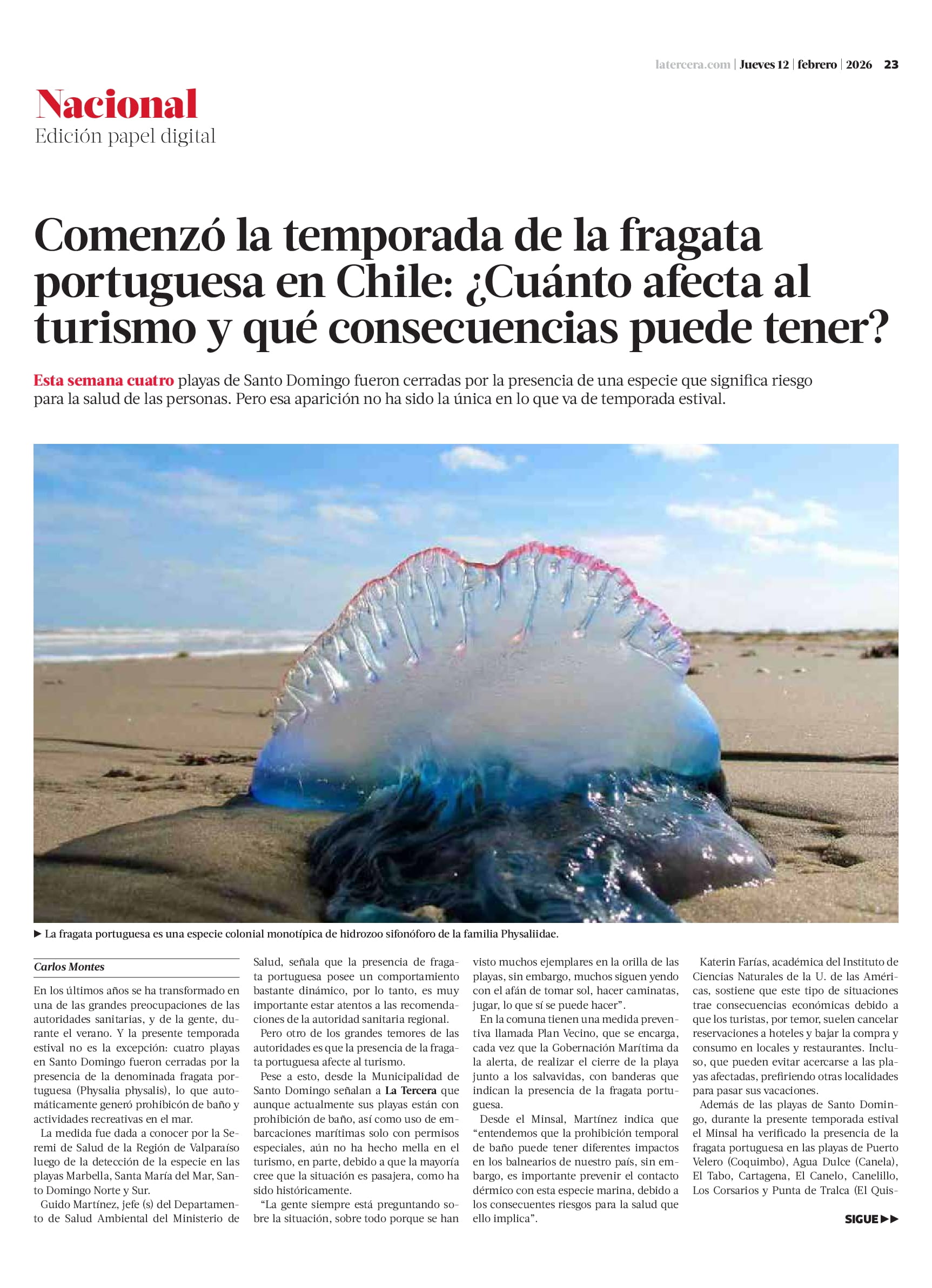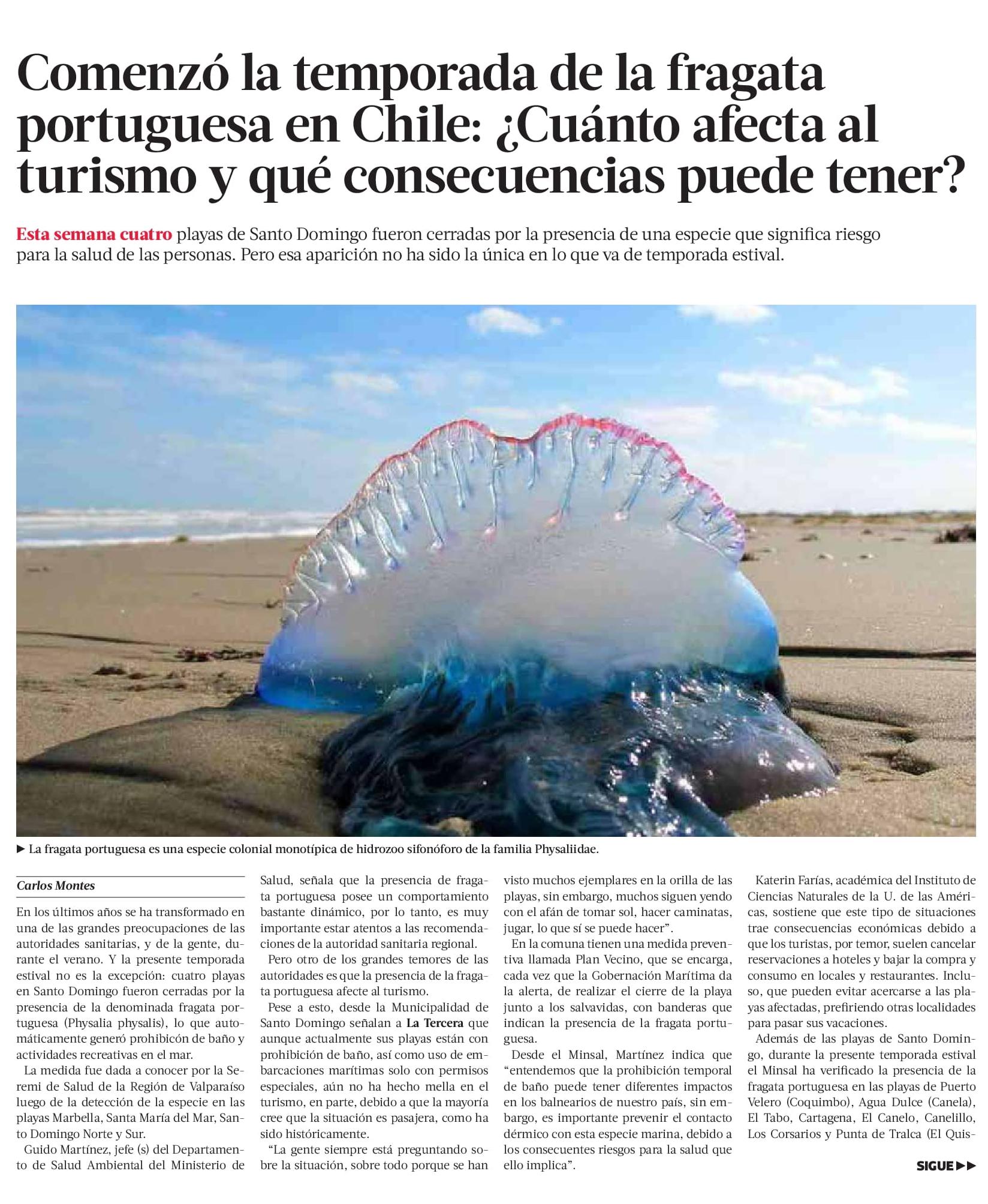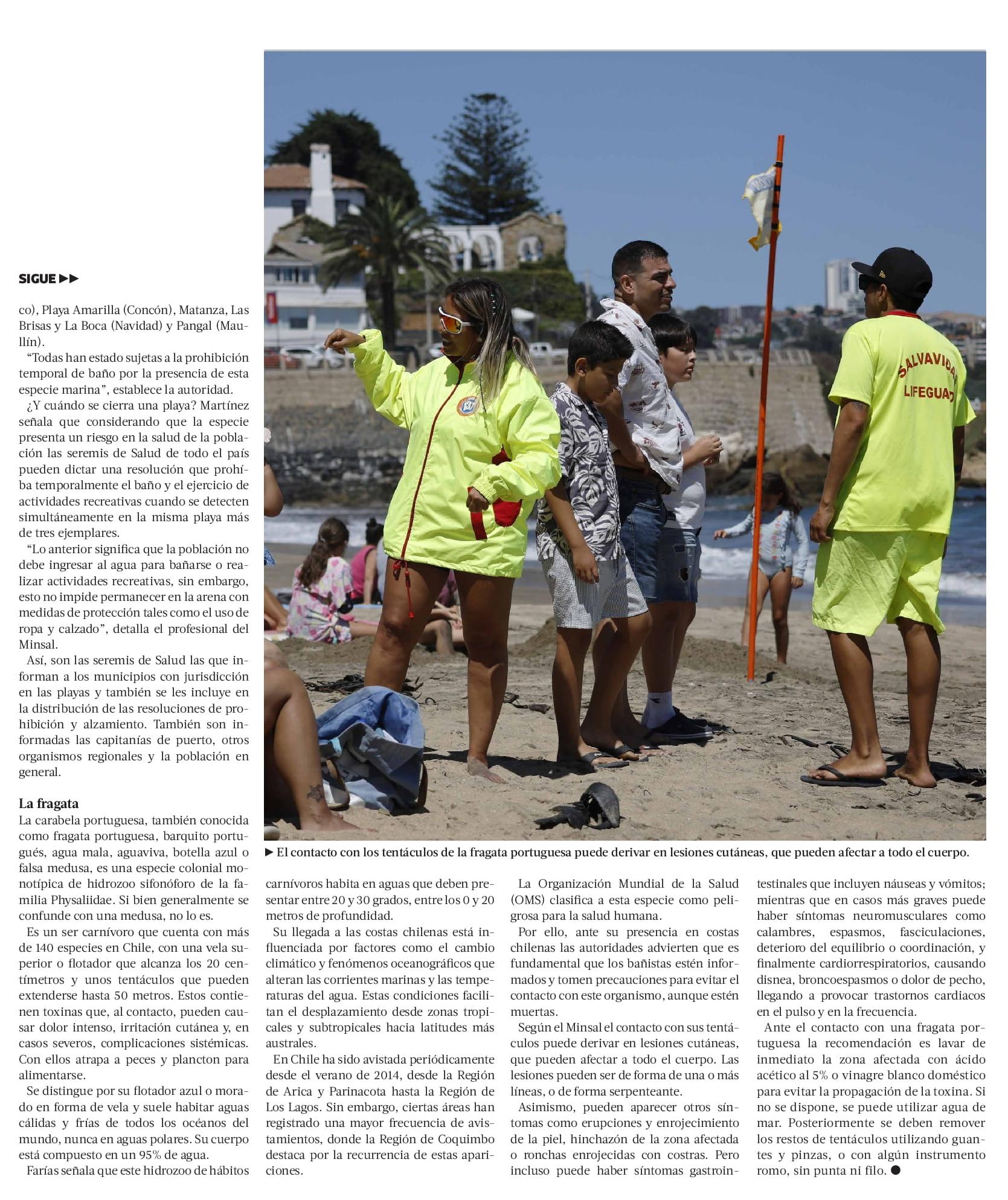 Desde el Minsal, Martínez indica que “entendemos que la prohibición temporal de baño puede tener diferentes impactos en los balnearios de nuestro país, sin embargo, es importante prevenir el contacto dérmico con esta especie marina, debido a los consecuentes riesgos para la salud que ello implica”.