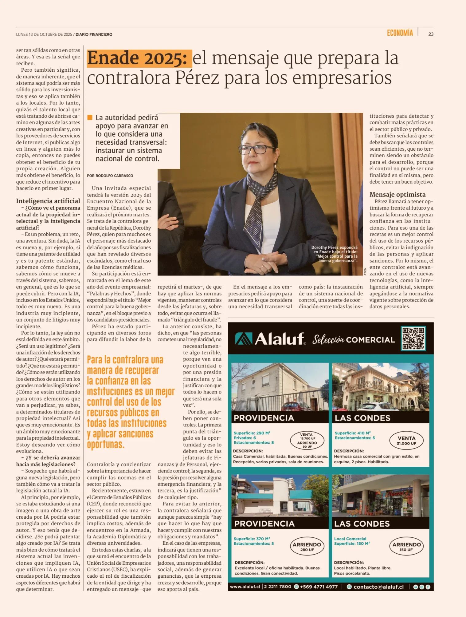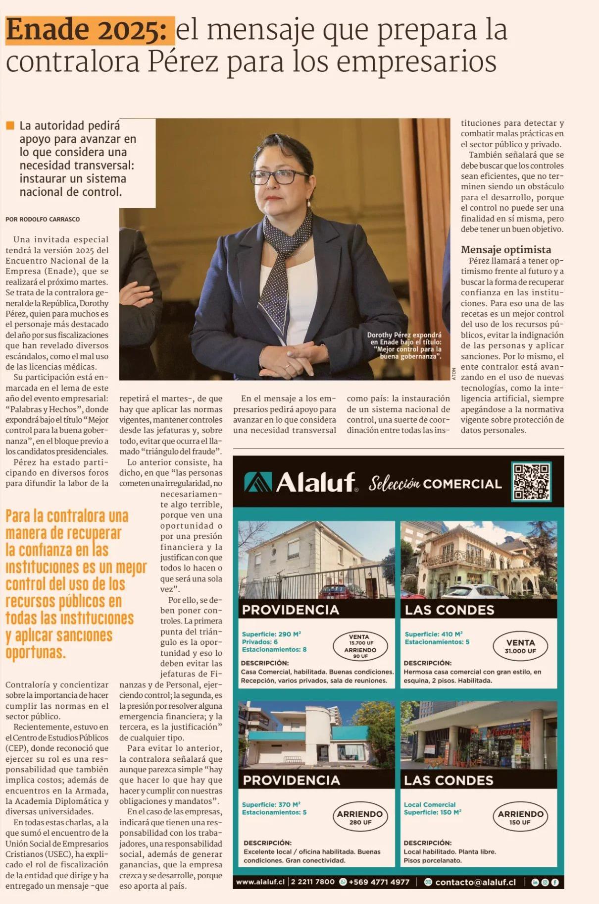 Una invitada especial tendrá la versión 2025 del Encuentro Nacional de la Empresa (Enade), que se realizará el próximo martes. Se trata de la contralora general de la República, Dorothy Pérez, quien para muchos es el personaje más destacado del año por sus fiscalizaciones que han revelado diversos escándalos, como el mal uso de las licencias médicas.