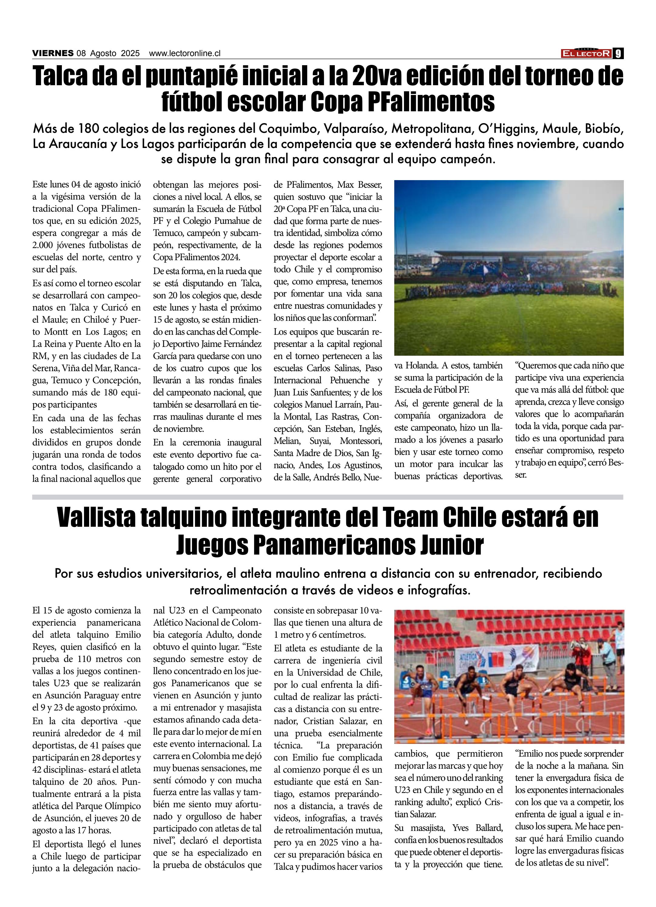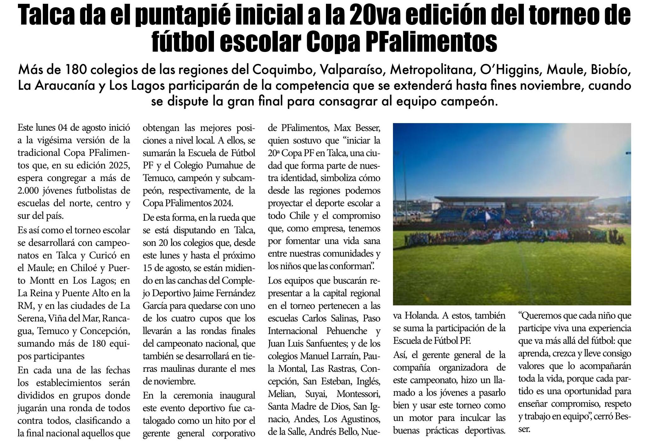 Este lunes 04 de agosto inició a la vigésima versión de la tradicional Copa PFalimentos que, en su edición 2025, espera congregar a más de 2.000 jóvenes futbolistas de escuelas del norte, centro y sur del país. Es así como el torneo escolar se desarrollará con campeonatos en Talca y Curicó en el Maule; en Chiloé y Puerto Montt en Los Lagos; en La Reina y Puente Alto en la RM, y en las ciudades de La Serena, Viña del Mar, Rancagua, Temuco y Concepción, sumando más de 180 equipos participantes En cada una de las fechas los establecimientos serán divididos en grupos donde jugarán una ronda de todos contra todos, clasificando a la final nacional aquellos que obtengan las mejores posiciones a nivel local. A ellos, se sumarán la Escuela de Fútbol PF y el Colegio Pumahue de Temuco, campeón y subcampeón, respectivamente, de la Copa PFalimentos 2024.